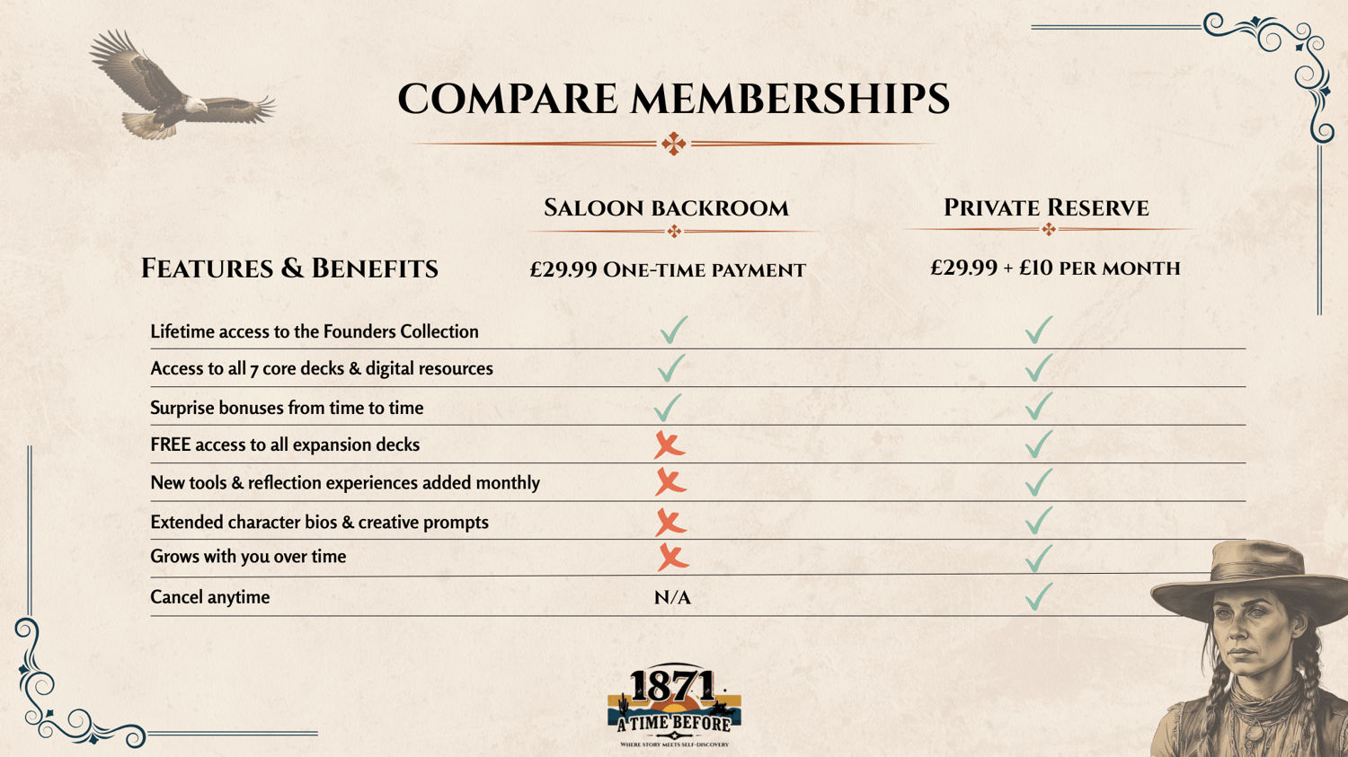 The Private Reserve add-on (£10/month) opens the doors to extra monthly resources, exclusive character insights, creative prompts, and bonus materials to deepen your reflection and practice. And that's not all - you'll get access to advanced resources, themed expansions, behind-the-scenes content, and early access to new releases, and all expansion packs for free. It’s for those who want to journey even further.