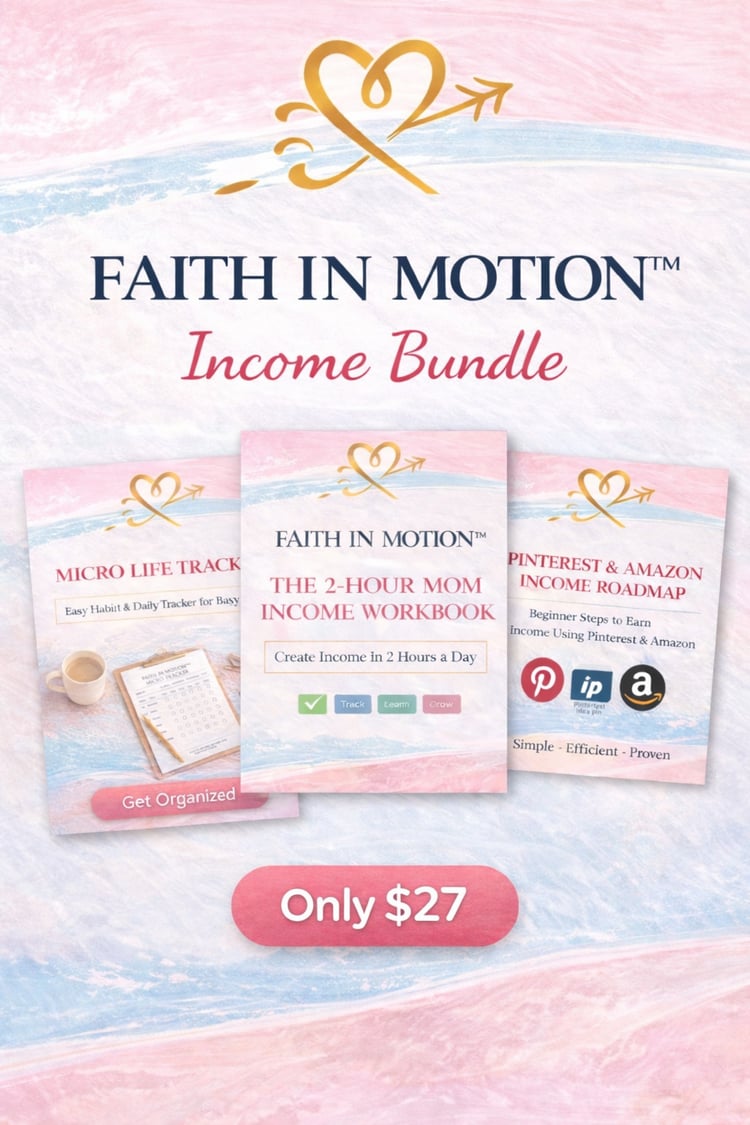 Three beginner-friendly Faith In Motion™ guides bundled into one simple, powerful system for busy moms. Build clarity, consistency, and income in just 2 hours a day — without overwhelm.