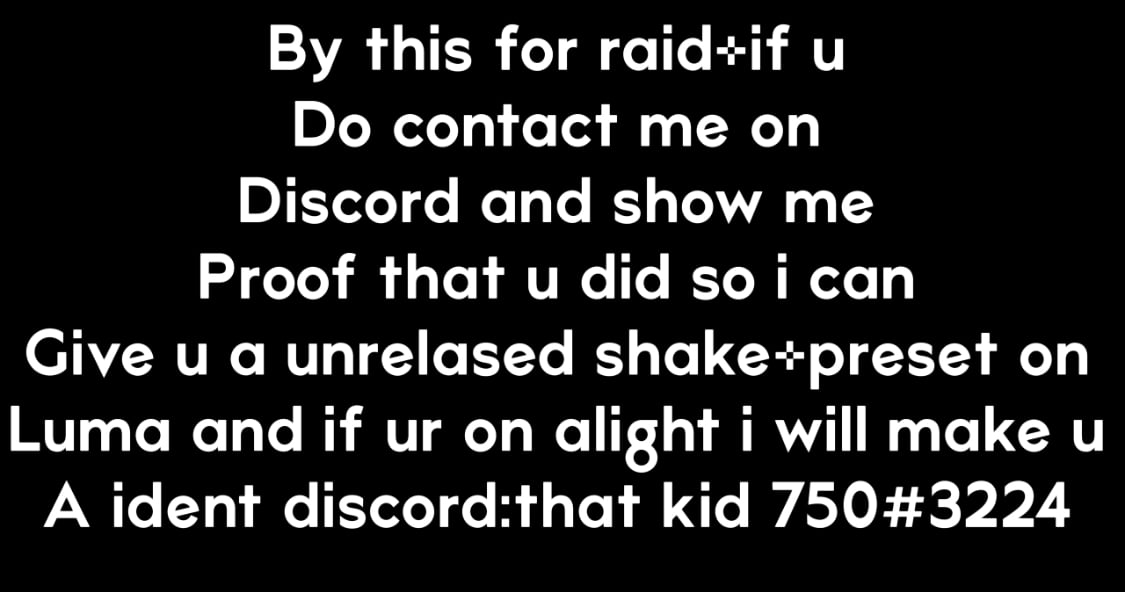 By this for raid+if u Do contact me on Discord and show me Proof that u did so i can Give u a unrelased shake+preset on Luma and if ur on alight i will make u A ident discord:that kid 750#3224