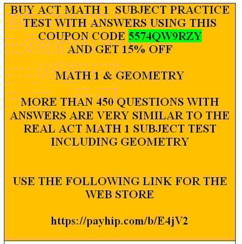 BUY ACT MATH 1 SUBJECT PRACTICE TEST WITH ANSWERS USING THIS COUPON CODE 5574QW9RZYAND GET 15% OFFMATH 1 & GEOMETRYMORE THAN 450 QUESTIONS WITH ANSWERS ARE VERY SIMILAR TO THE REAL ACT MATH 1 SUBJECT TEST INCLUDING GEOMETRYUSE THE FOLLOWING LINK ...