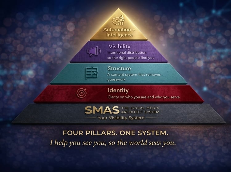 Phase 1: Visibility — That's what you're getting right now. Four pillars. One system. You will get clear on your identity, build your content structure, show up where your people are, automate your consistency, and use intelligence to grow without starting over. This is where everything starts.