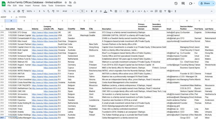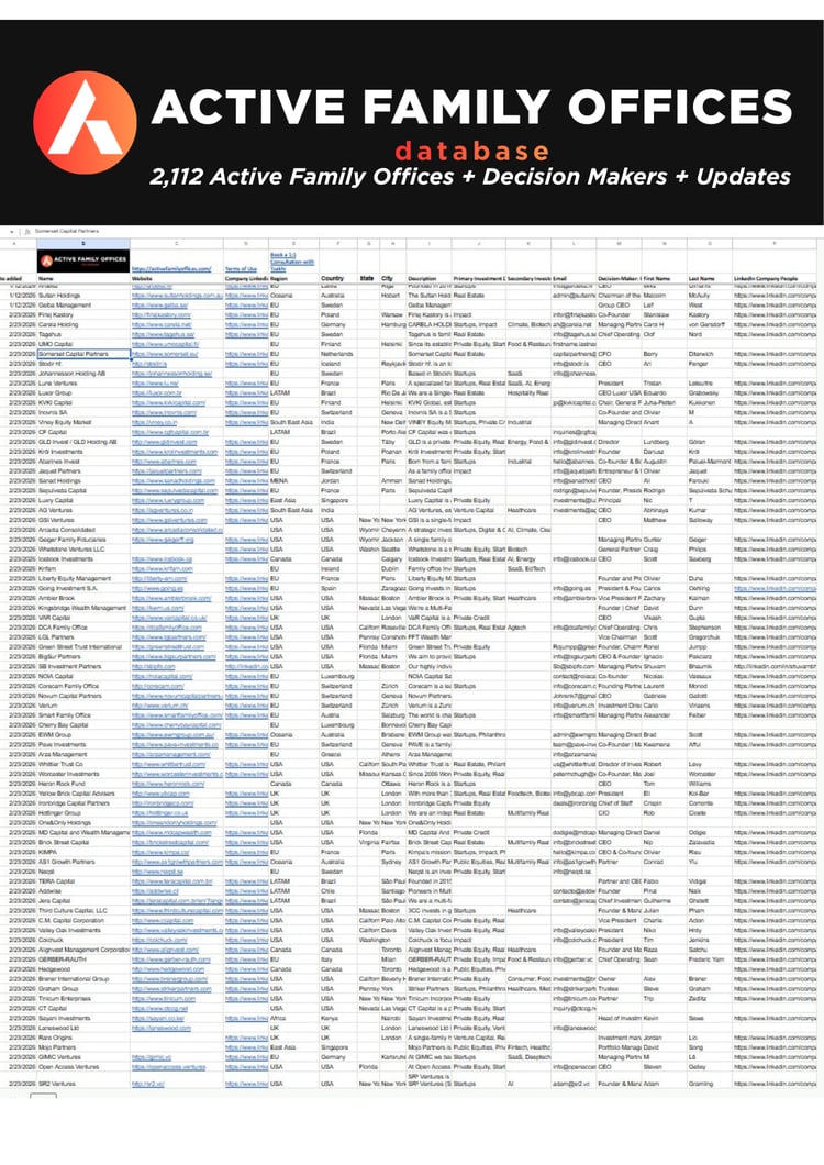 We cannot guarantee that the family offices in the database are actively looking for investment opportunities at the time of your purchase, of course (beware - anyone making such claims is obviously lying).