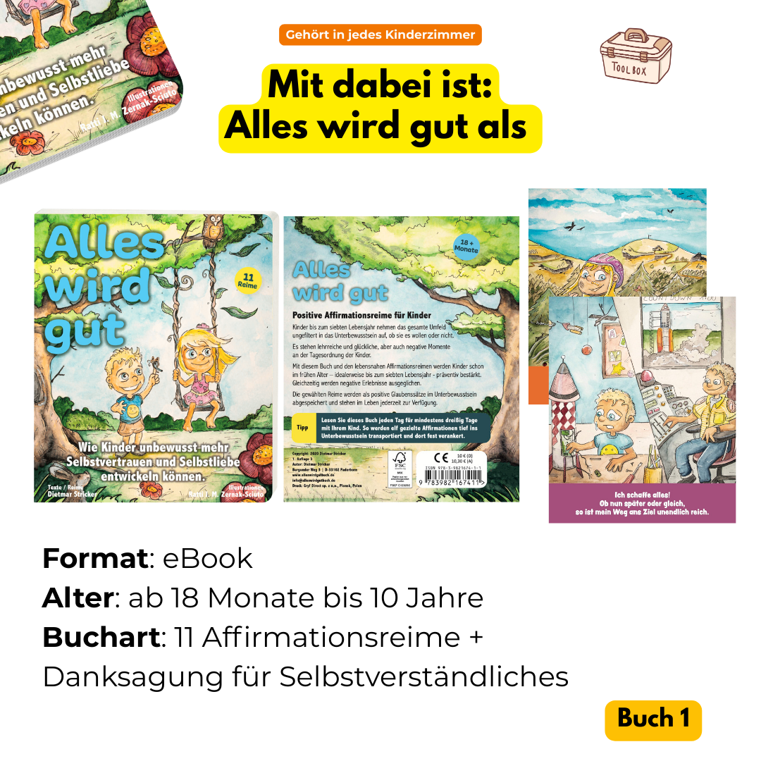 Kinderbücher, Spiel, Ausmalhefte und meine große Affirmations‑Sammlung – für Wochen voller positiver Momente.