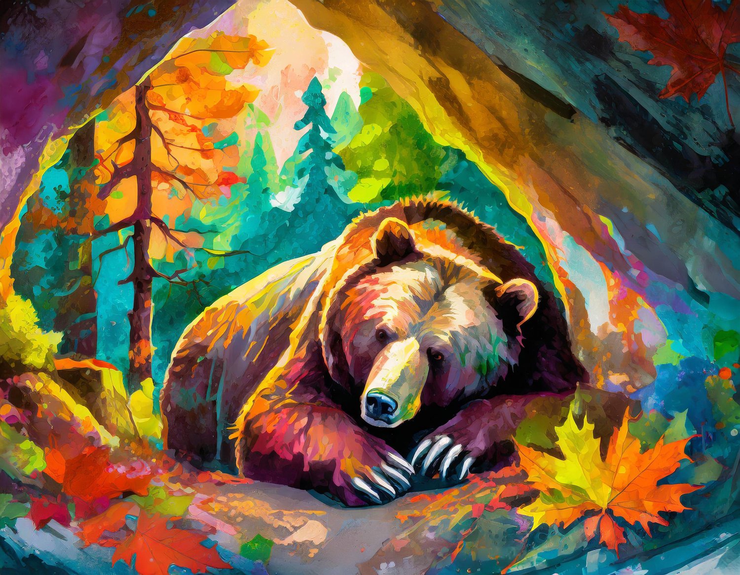 A Grizzly Bear Hibernating in a Autumn Cave Digital Art