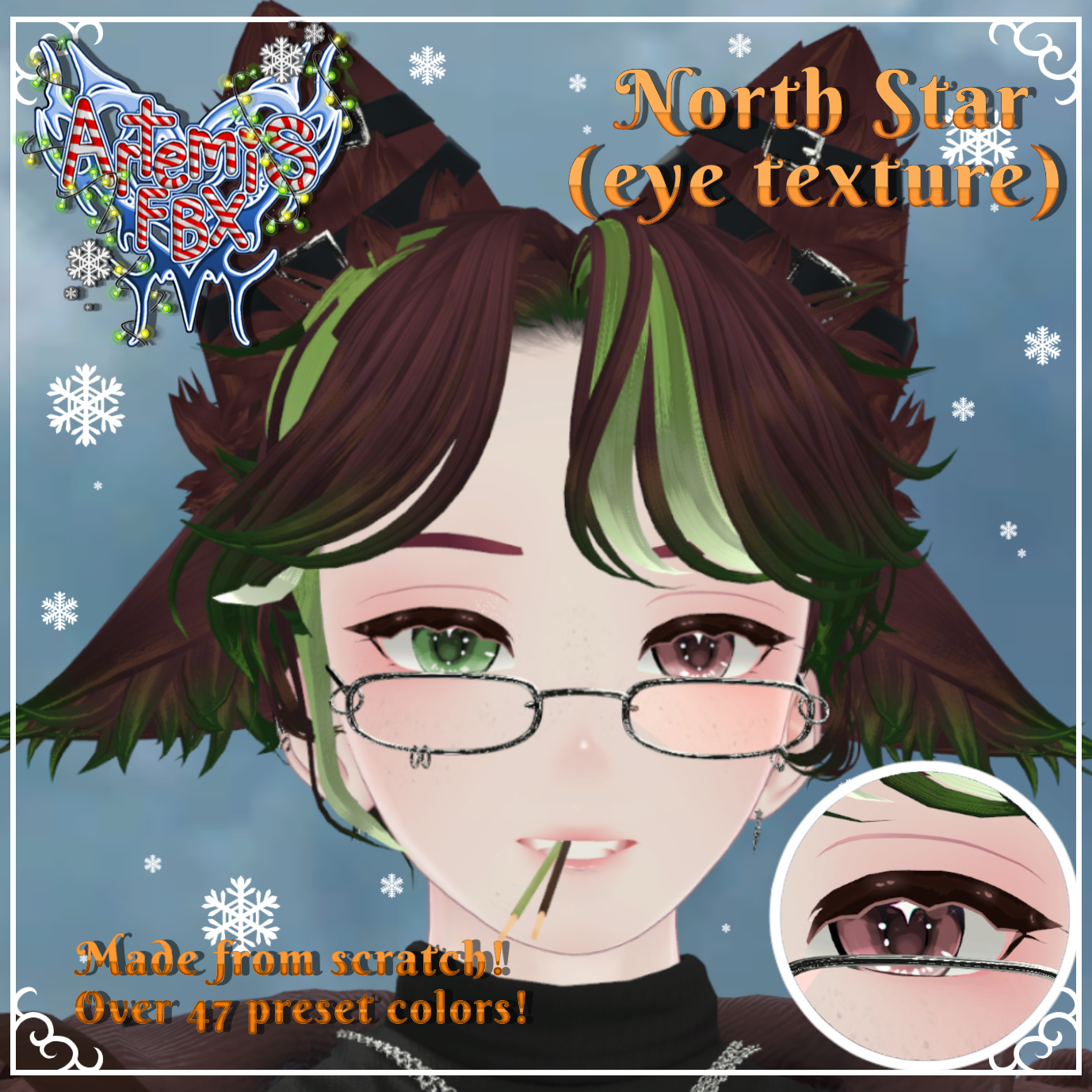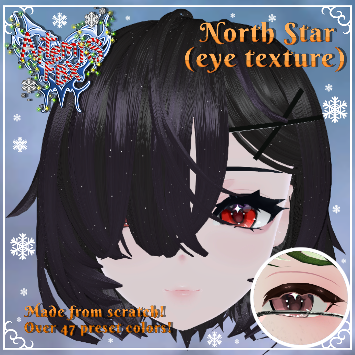 You get a transparent PNGs of the eye textures, there over all together 47 textures of a variety of colors! Fun to mix and match with and can be easily edited onto any head base! And there's emission/glitter maps!