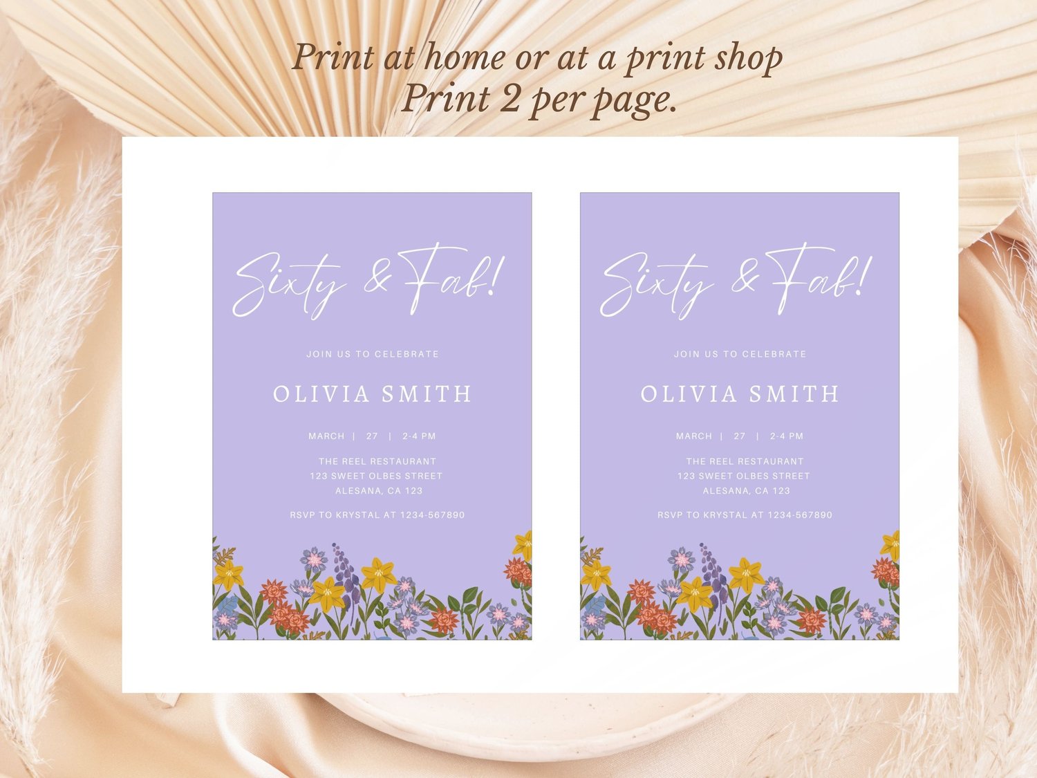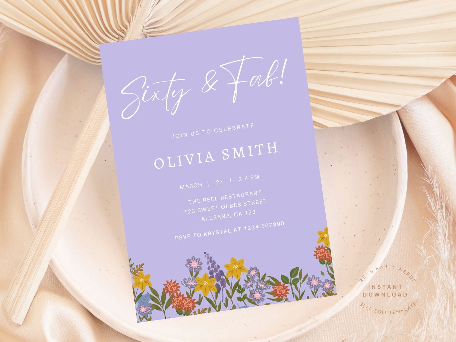Sixty and Fab Floral 60 Years Loved Birthday Invitation Template, Wildflower 60th Birthday Invitation Women, Elegant Invite for Her Sixty