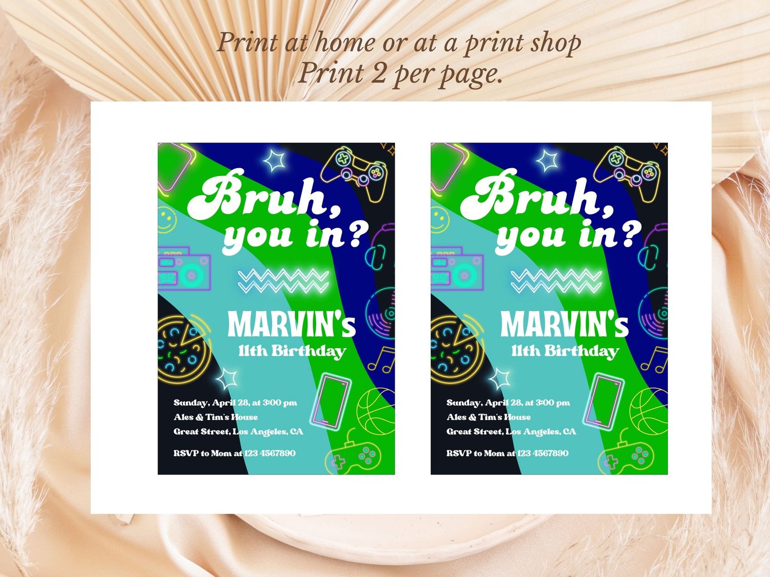 Bruh You In? Teen Birthday Party Invitation – Gaming, Basketball, Pizza, and Music-Themed Editable Canva Template for Boys