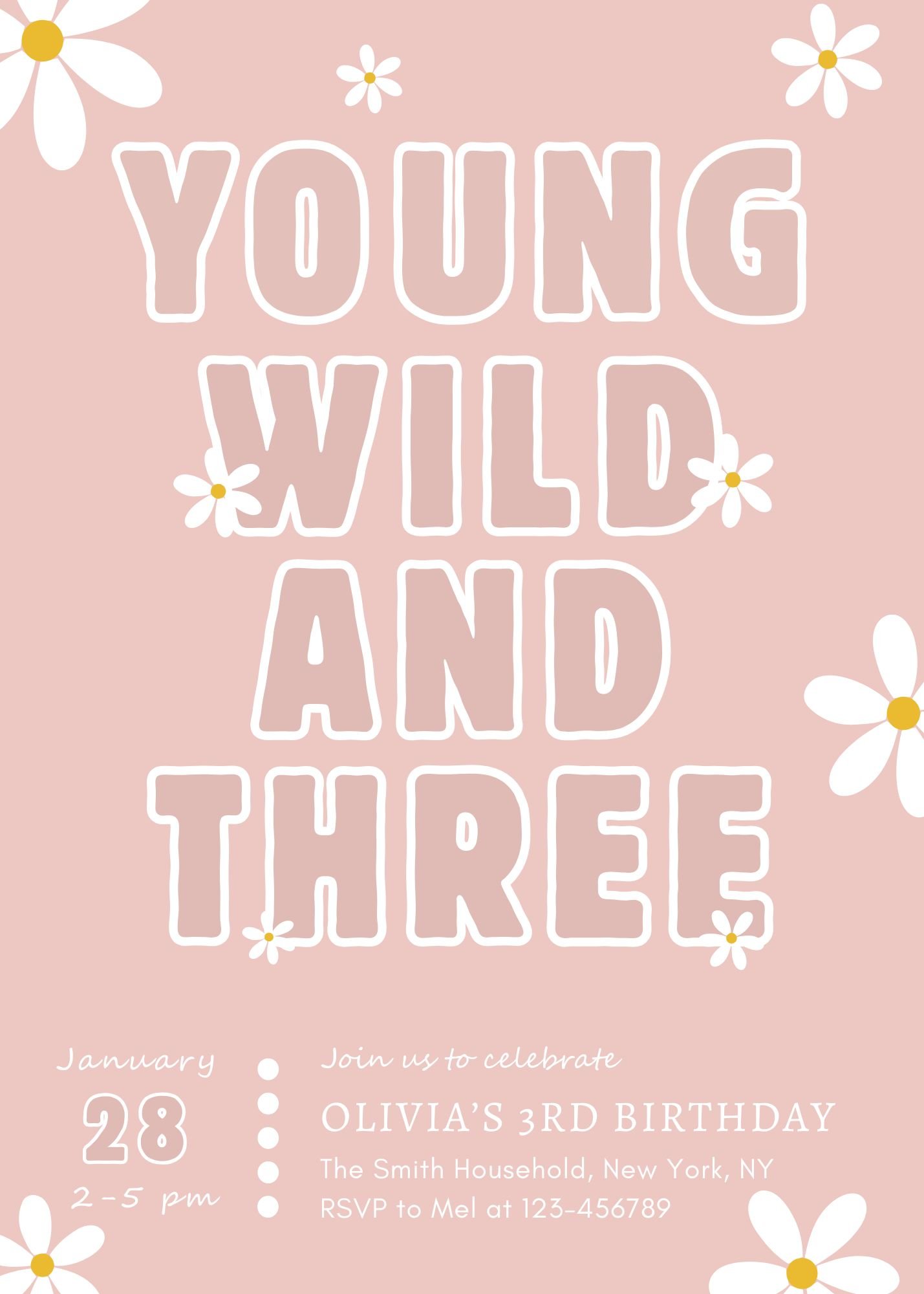 Editable Groovy Young Wild and THREE Pink Peach Daisy Rainbow 3RD BIRTHDAY Hippie Party Invitation Template Instant Download