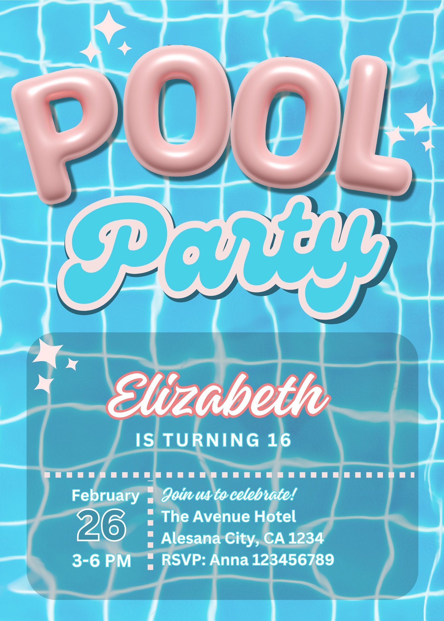 Editable Girls Pool Party Birthday Invitation Template Pool Party Preppy Pink Balloon Girls Teenage Birthday Invite Digital Download