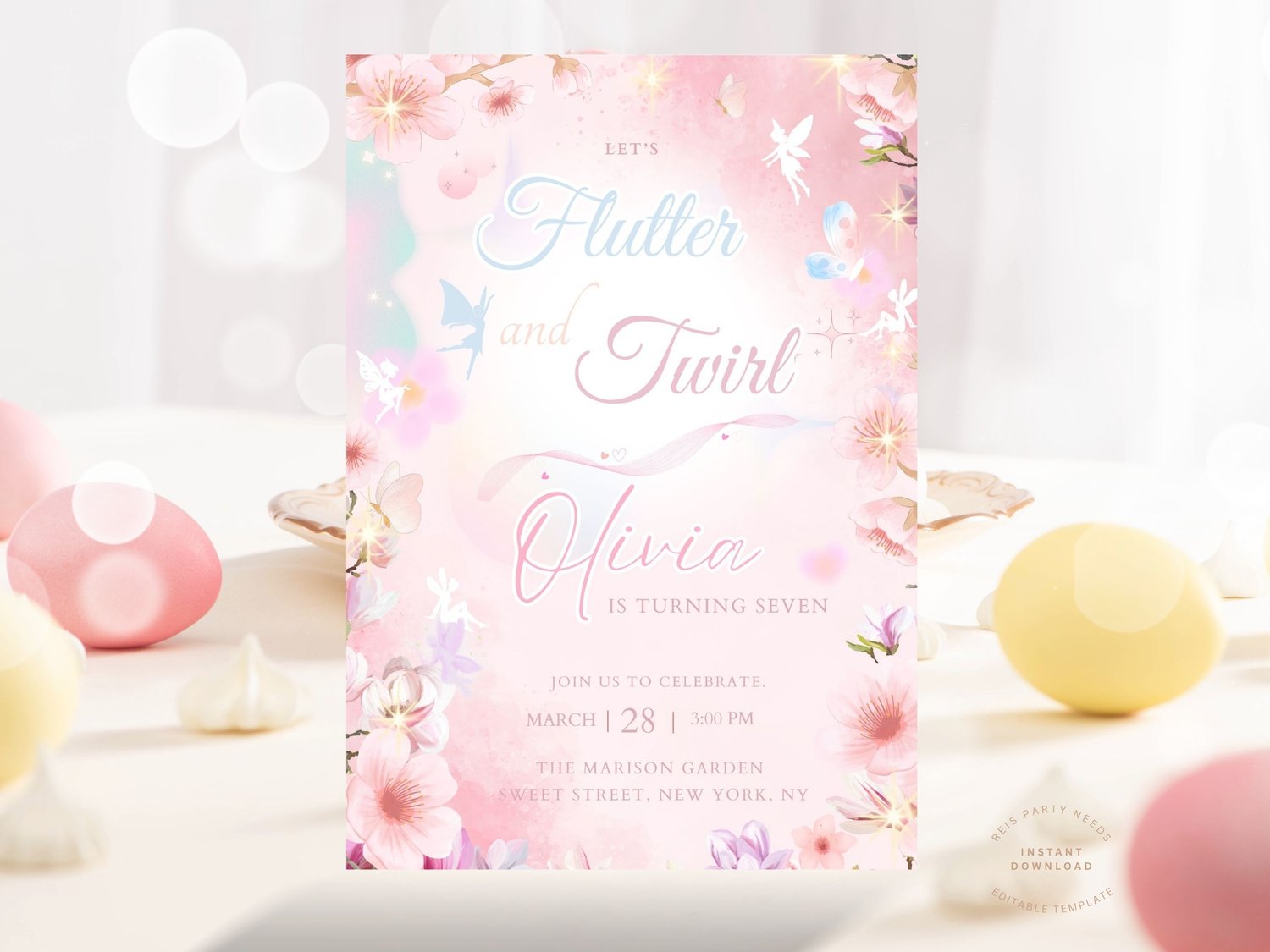 Enchanted Fairy Birthday Invitation, Whimsical, Magical Fairytale Fairies Birthday, Dreamy Pastel Fairy Floral Fairy Princess Party Editable