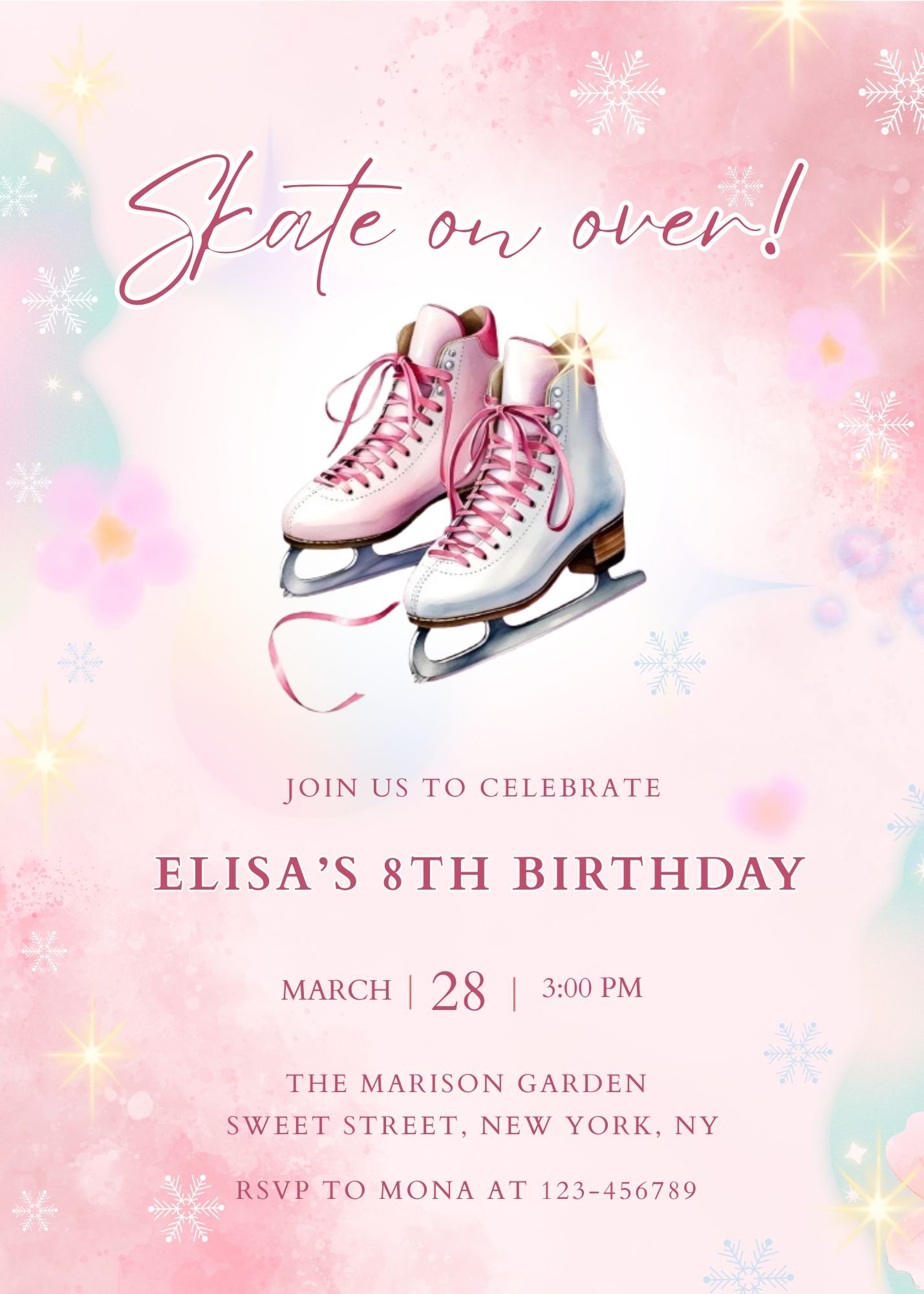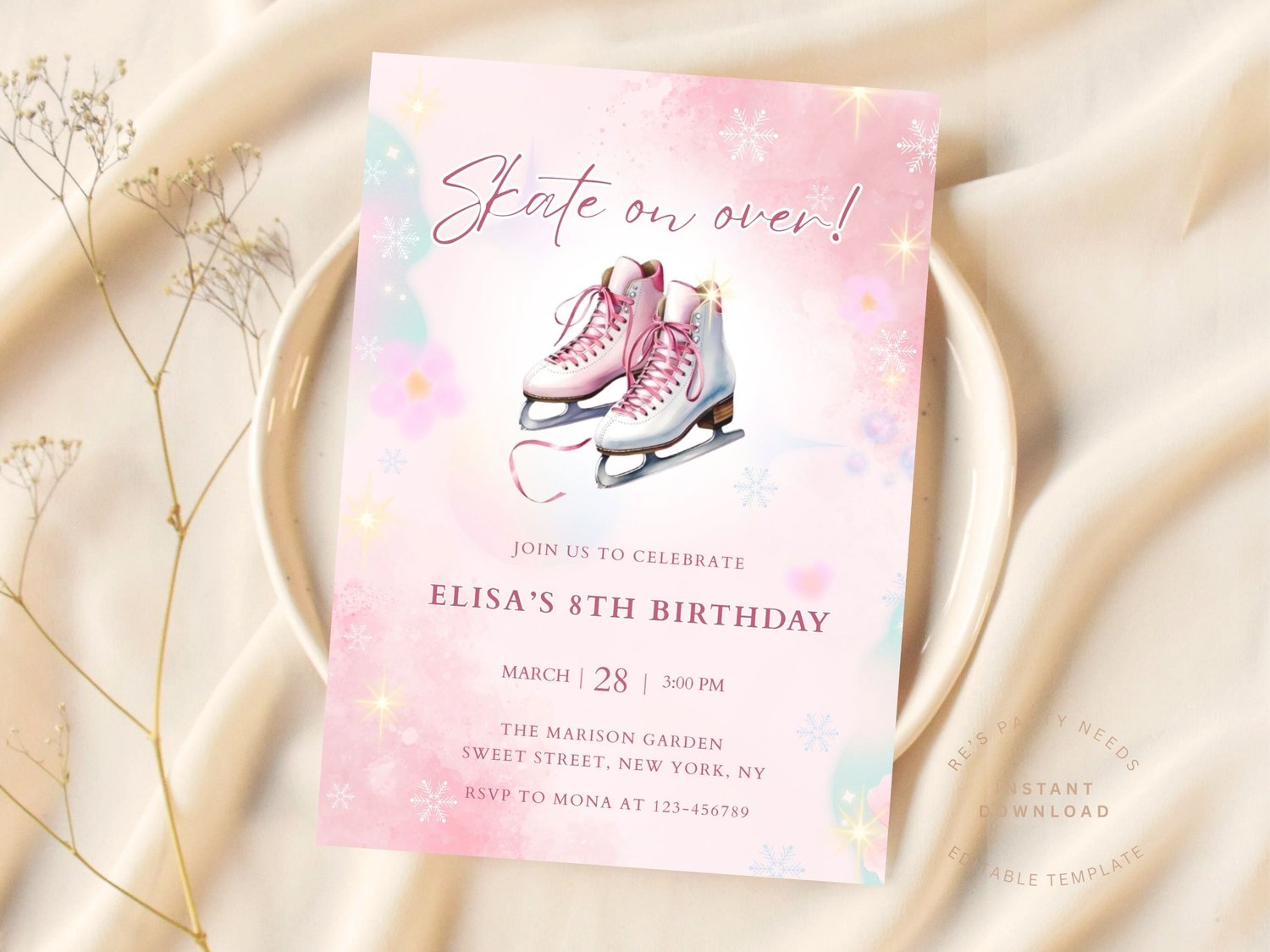 Pink Ice Skating Birthday Invitation, Editable Winter Skate Party Invite Template, Pastel Snowflake, Kid Outdoor Ice Rink, Instant Download