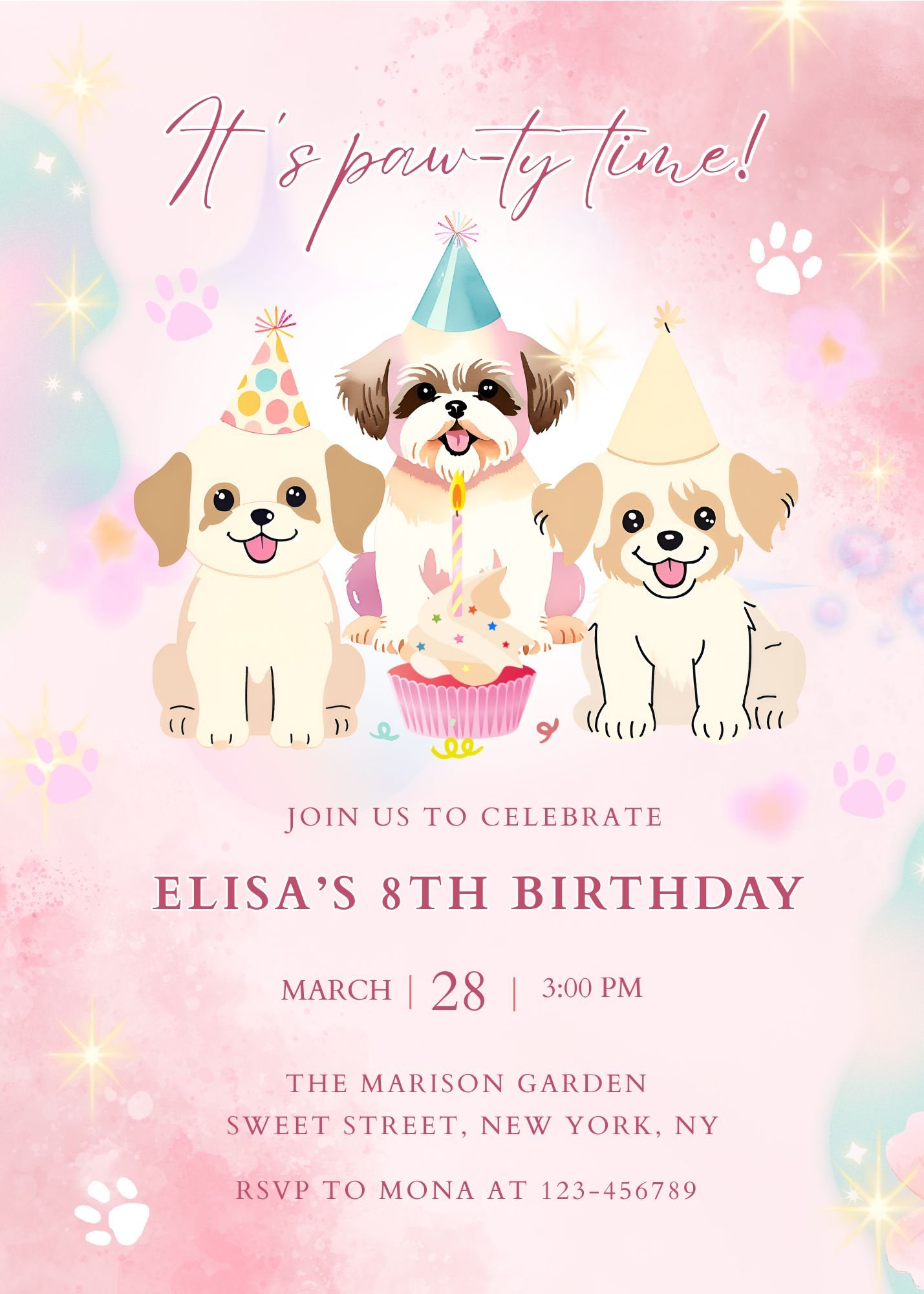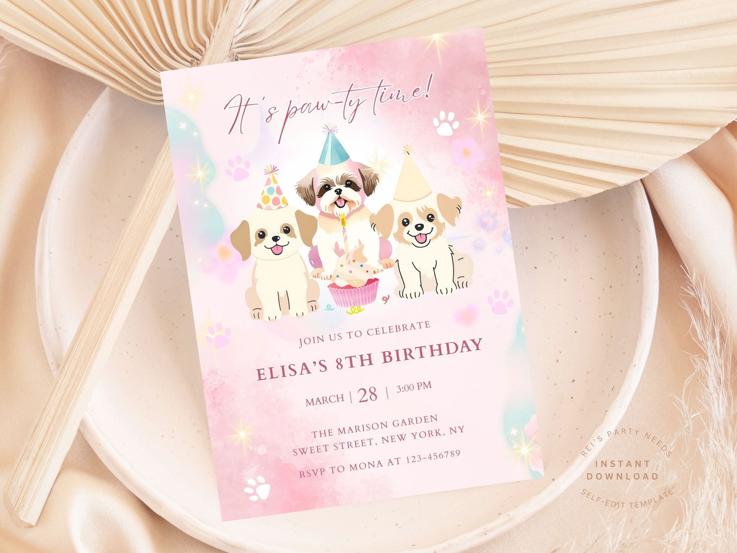 Pink Dog Birthday Invitation Printable, Cute Preppy Vibe Dogs Party Invite Pink Puppy Invitation, Girl Doggy Canva Dog Birthday Pawty Invite