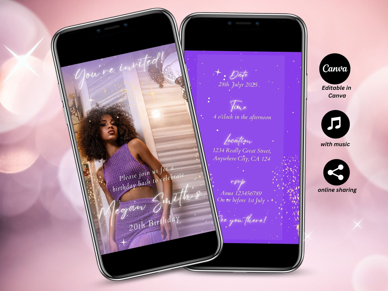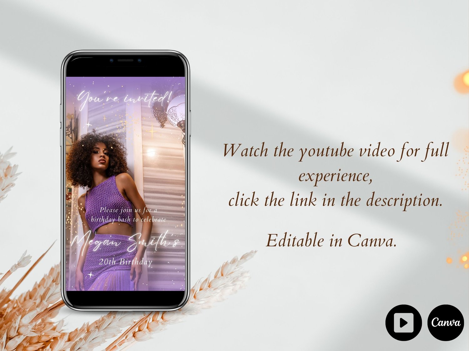 Purple Birthday Invitation Editable Template Digital Birthday Dinner Animated Video Invite instant Download Electronic Bday mobile invite