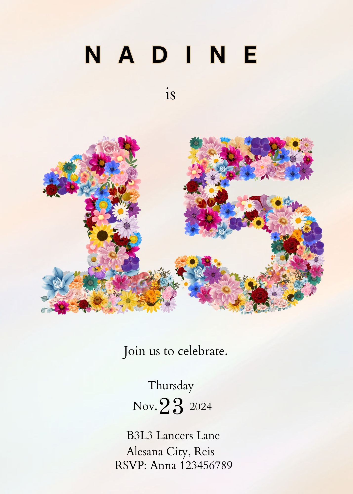 15th Birthday Invitation, Floral Number 15 Birthday Invite, Editable Quinceañera-Style Invitation, Printable Teen Girl Birthday Invitation