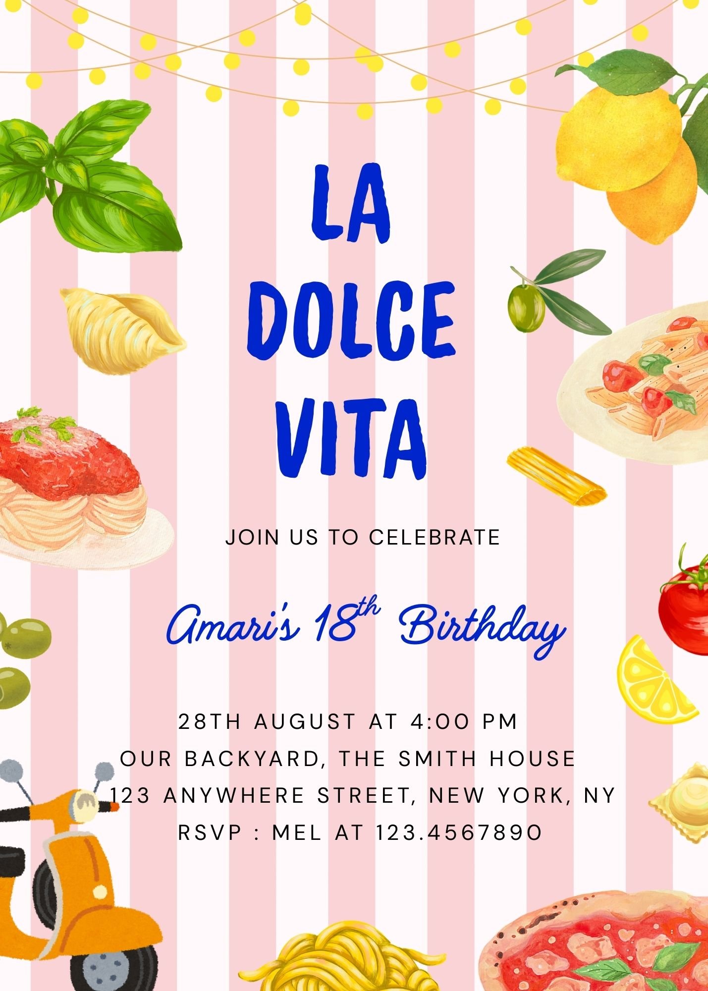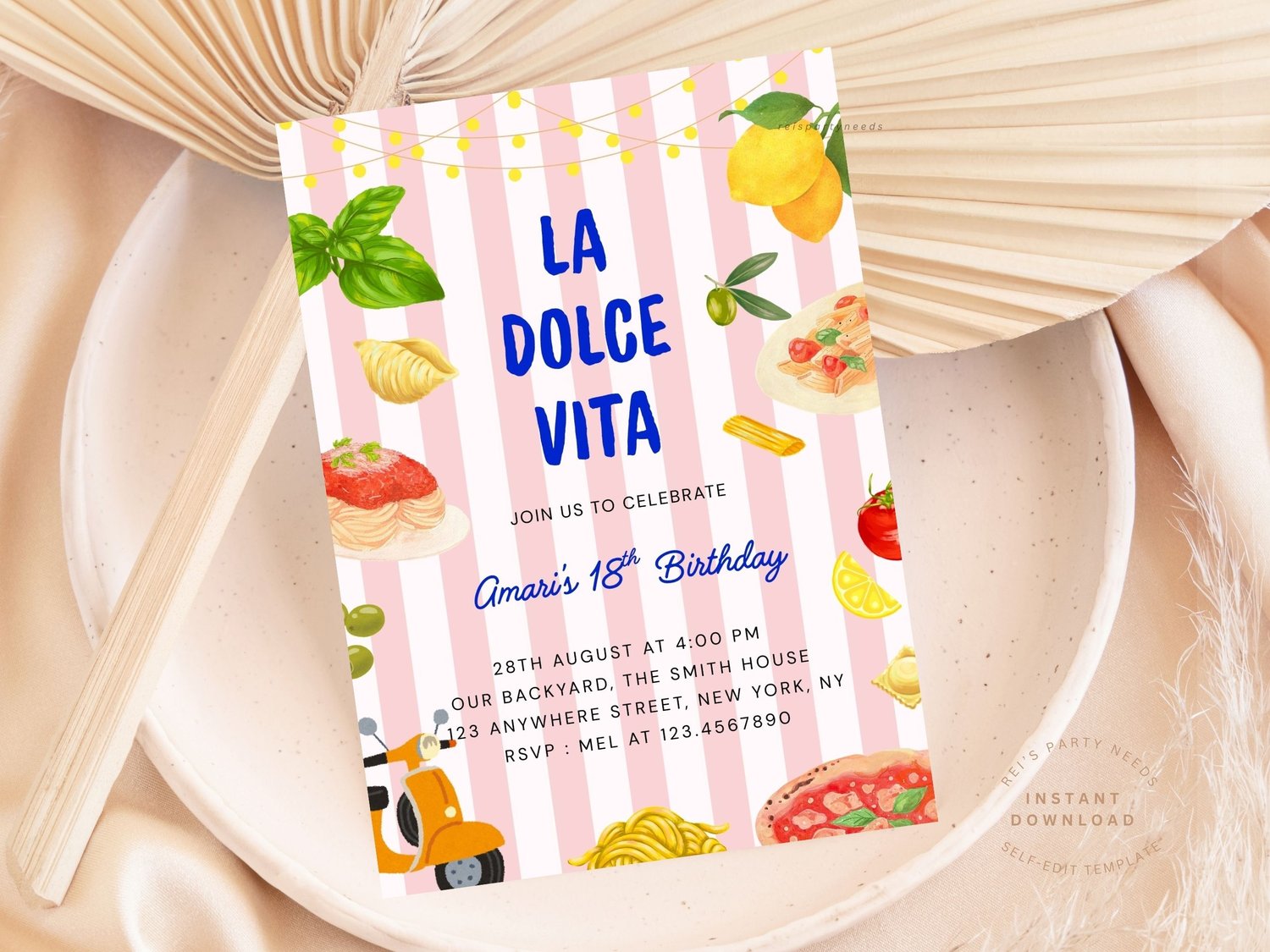 La Dolce Vita Birthday Invitation, Italian Summer Party Invite, Aesthetic Editable Amalfi Coast Theme, Ciao Bella, Pasta and Wine Party