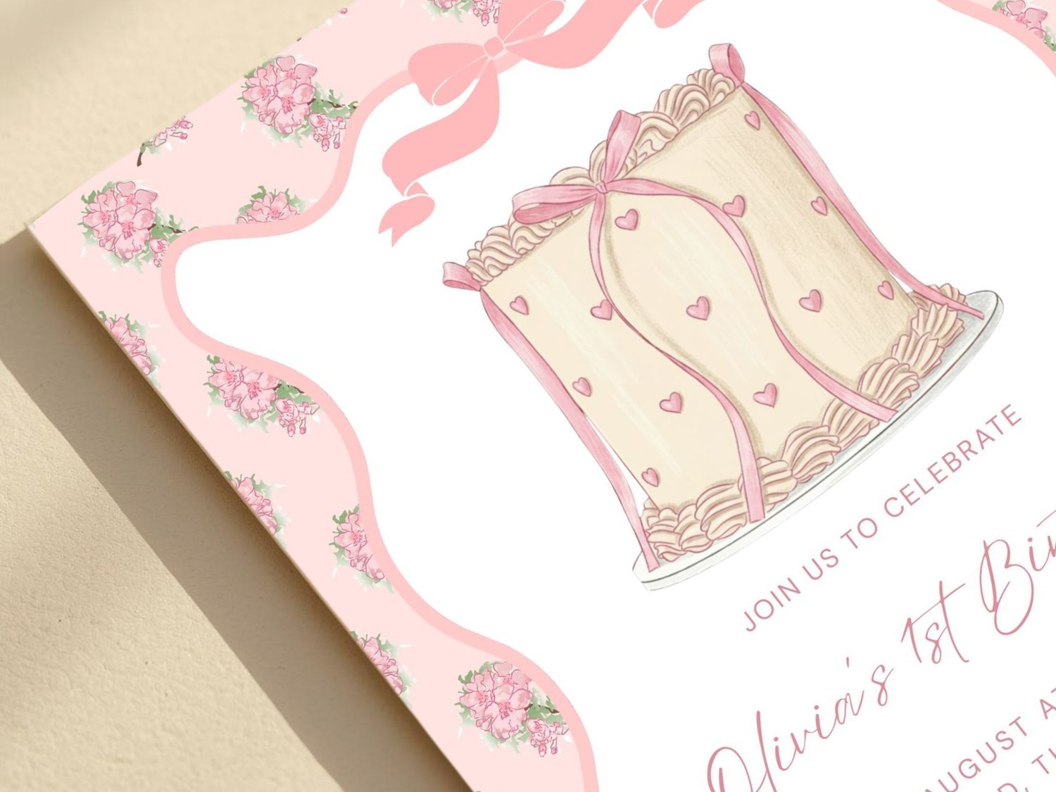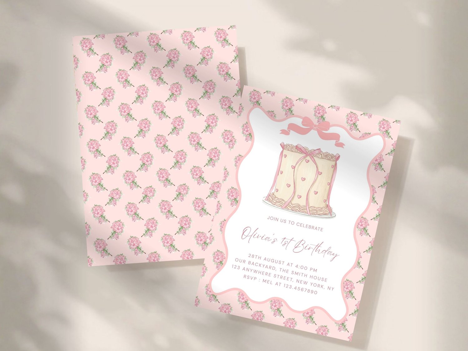 Pink Coquette Birthday Invitation Template, Vintage Cake Invite, Whimsical Floral Girl Birthday Party Invitation, Editable Canva Invite