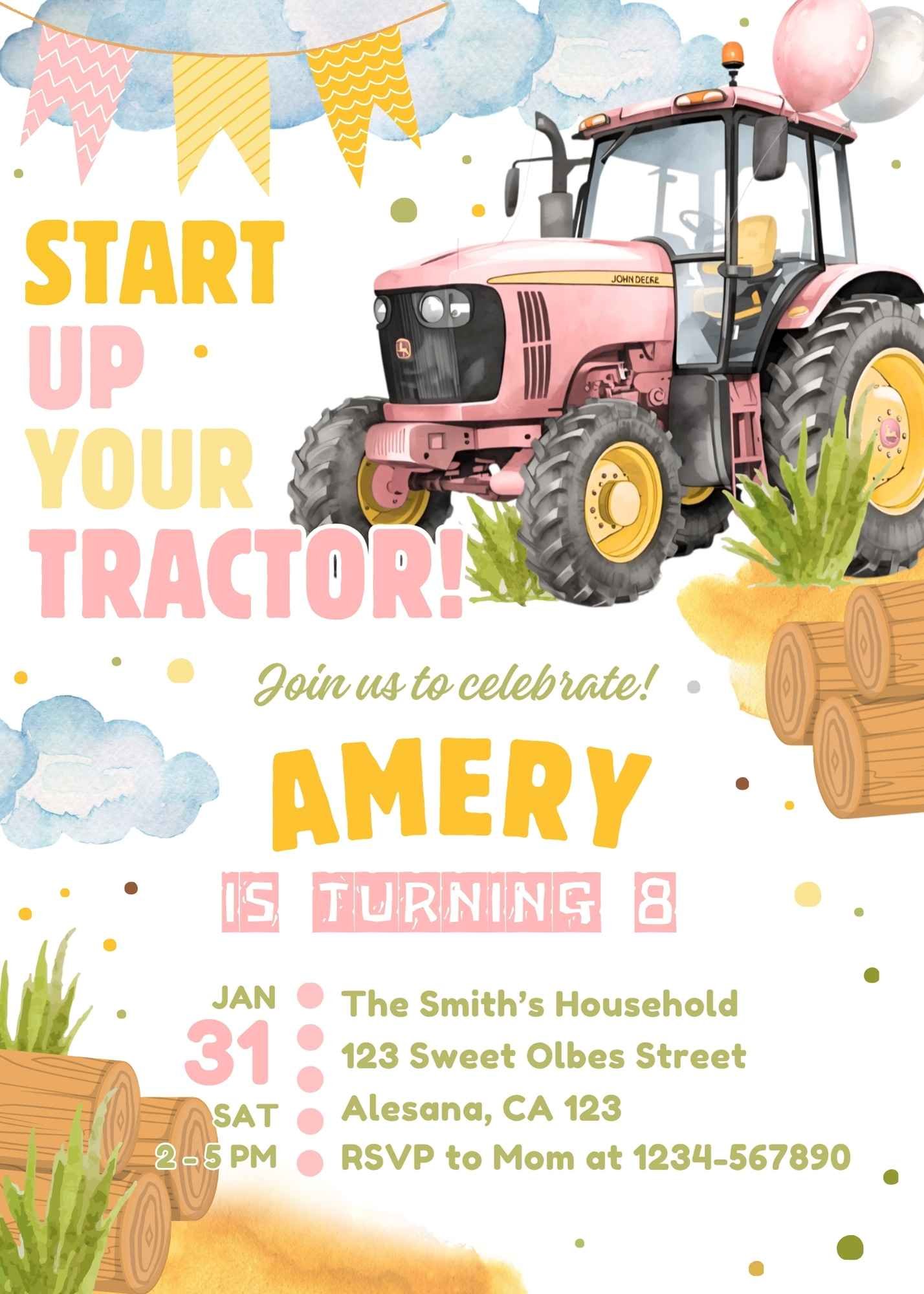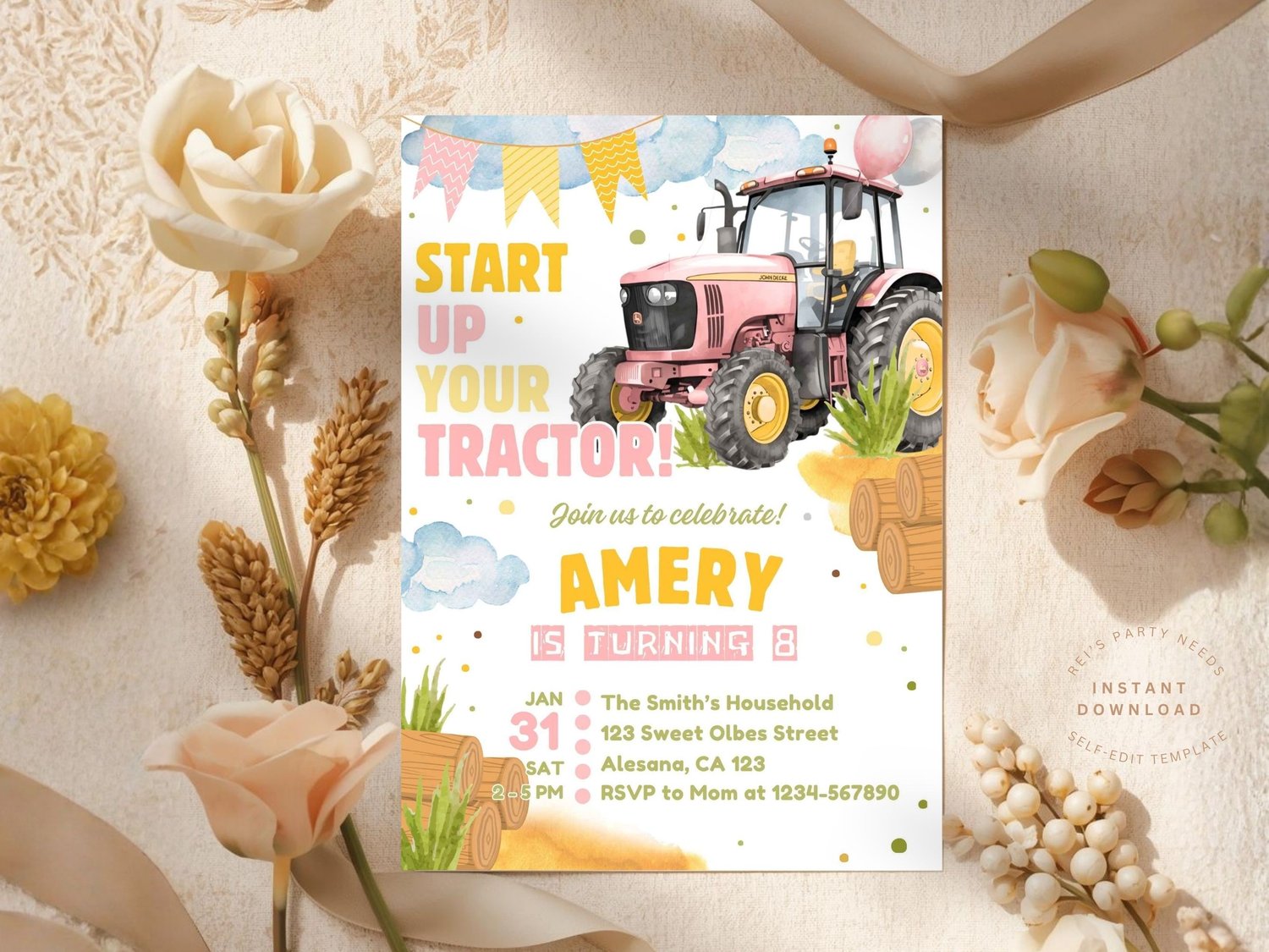 Pink Tractor Birthday Invitation Template, Girl Farm Birthday Invite, Tractor Party Invitation, Editable Cute Barnyard Animals Birthday