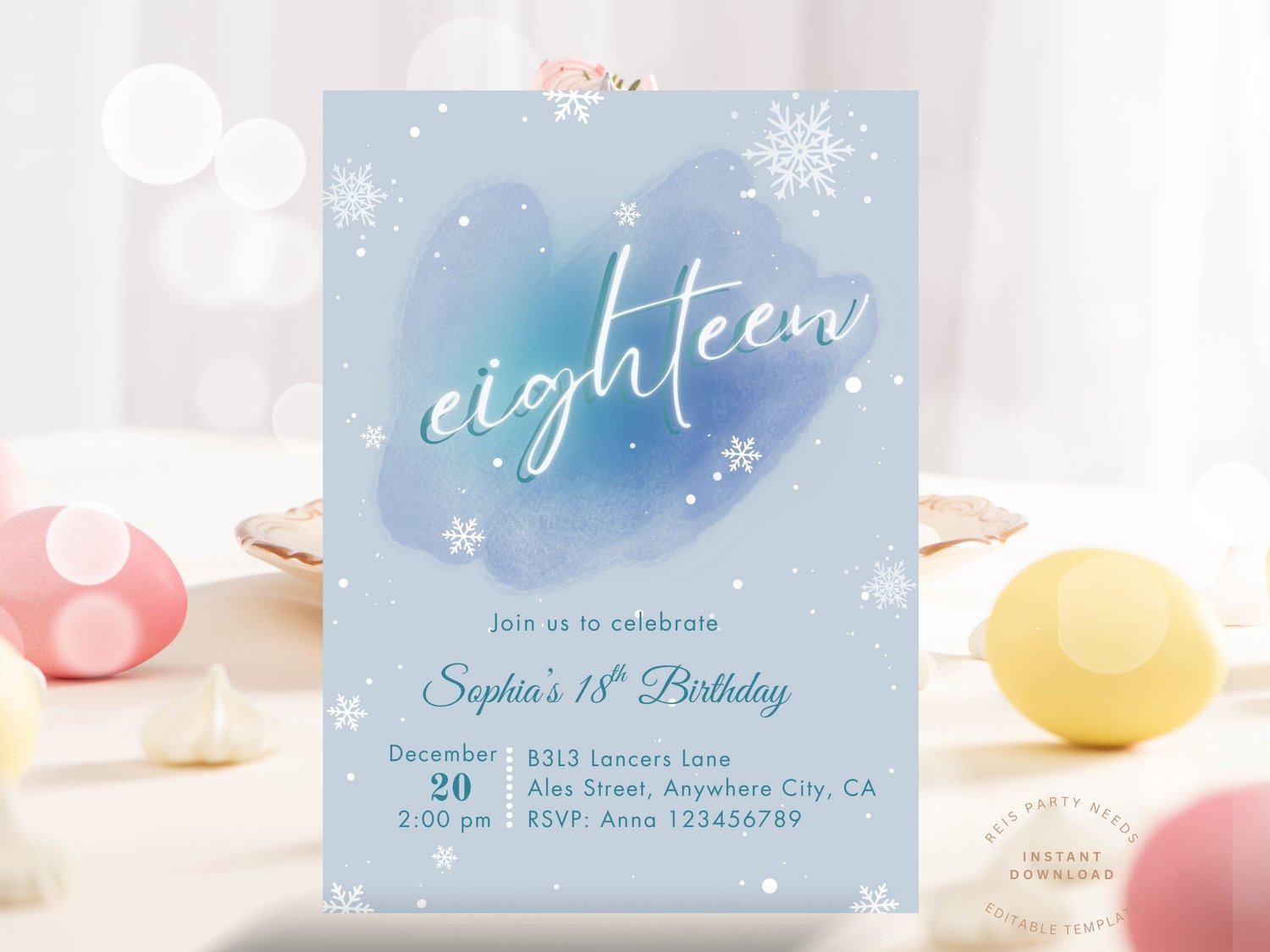Editable 18th Birthday Winter Snow Birthday Invitation, Minimalist Eighteen Birthday Invite, Winter Party Birthday Invitation for 18th