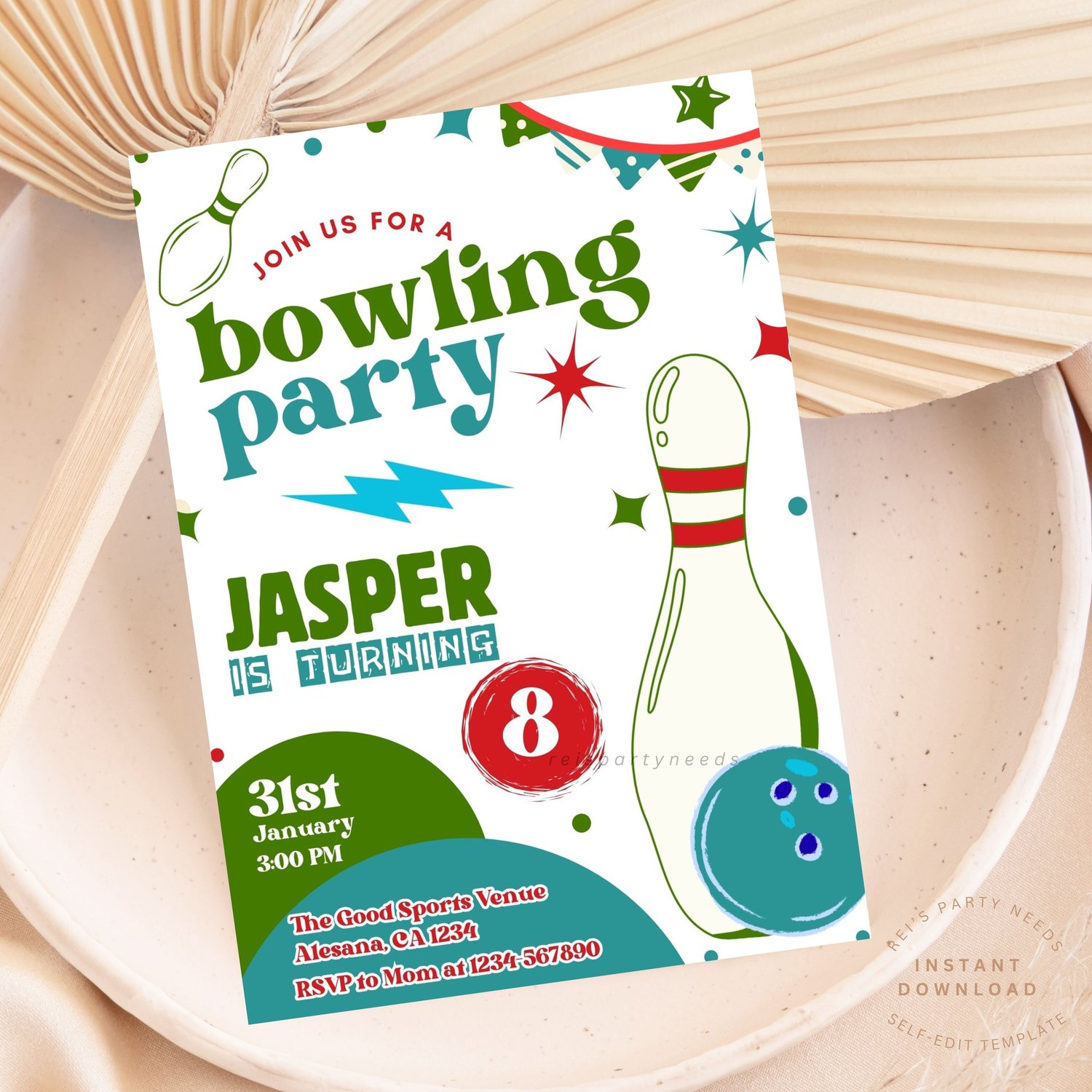 Editable Bowling Birthday Invitation Template, Printable Strike Up Some Fun Birthday Party Invitations, Green Blue Boy Bowling Invite Card