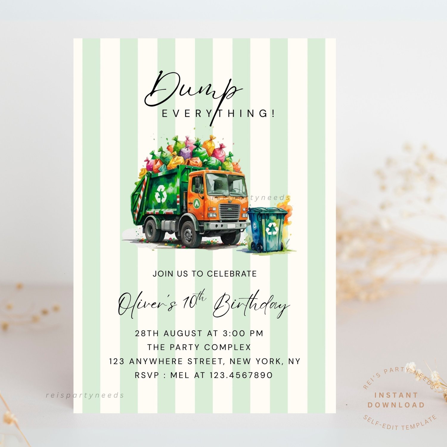 Trash Truck Invitation, Dump Everything Invite, Garbage Truck Invite, Green Dump Truck Birthday Invite, Any Age Boy Girl Birthday Invitation
