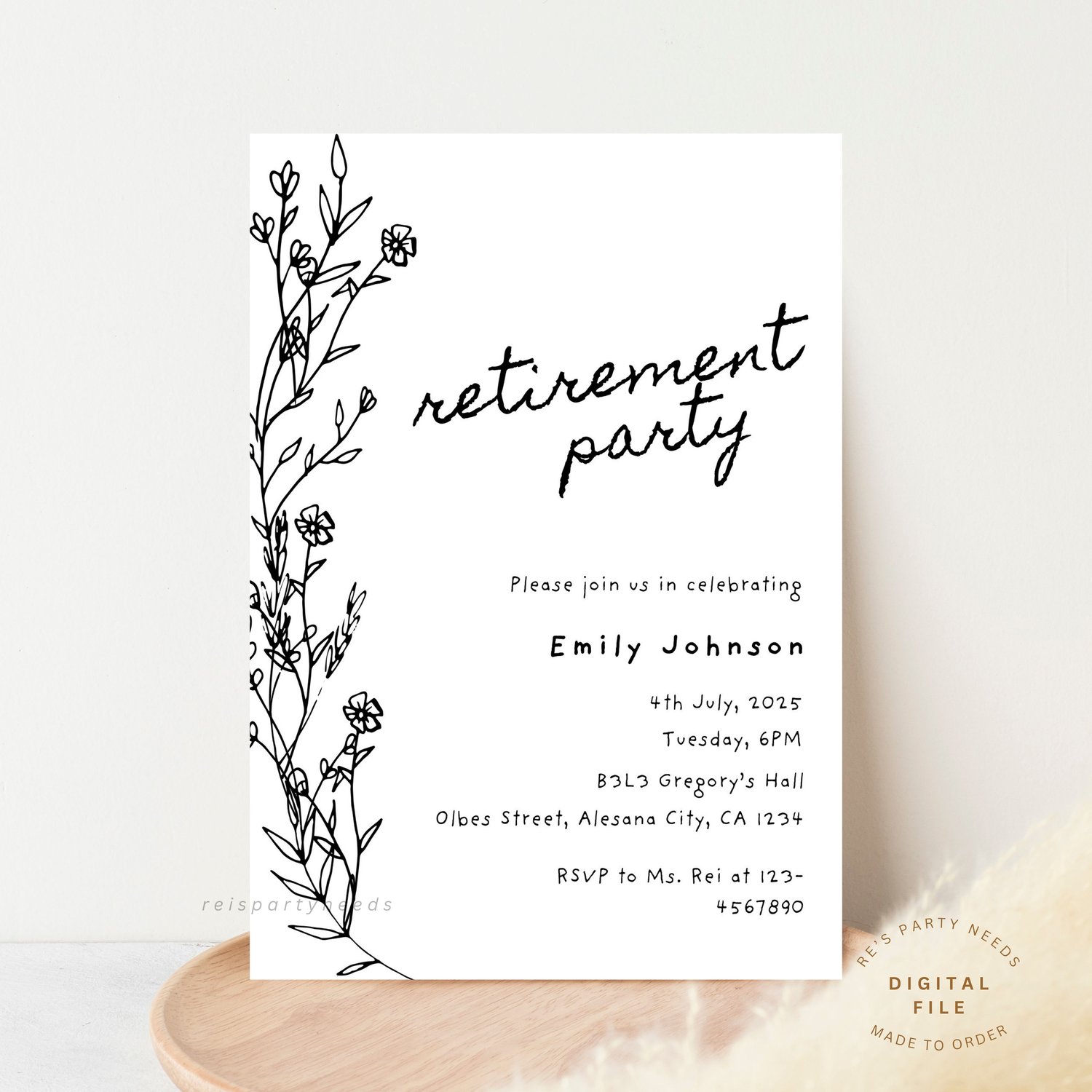 Editable Hand Drawn Retirement Invitation Template, Simple Retirement Party Floral Invite, Scribble Fussy Illustration Wild flower Invite