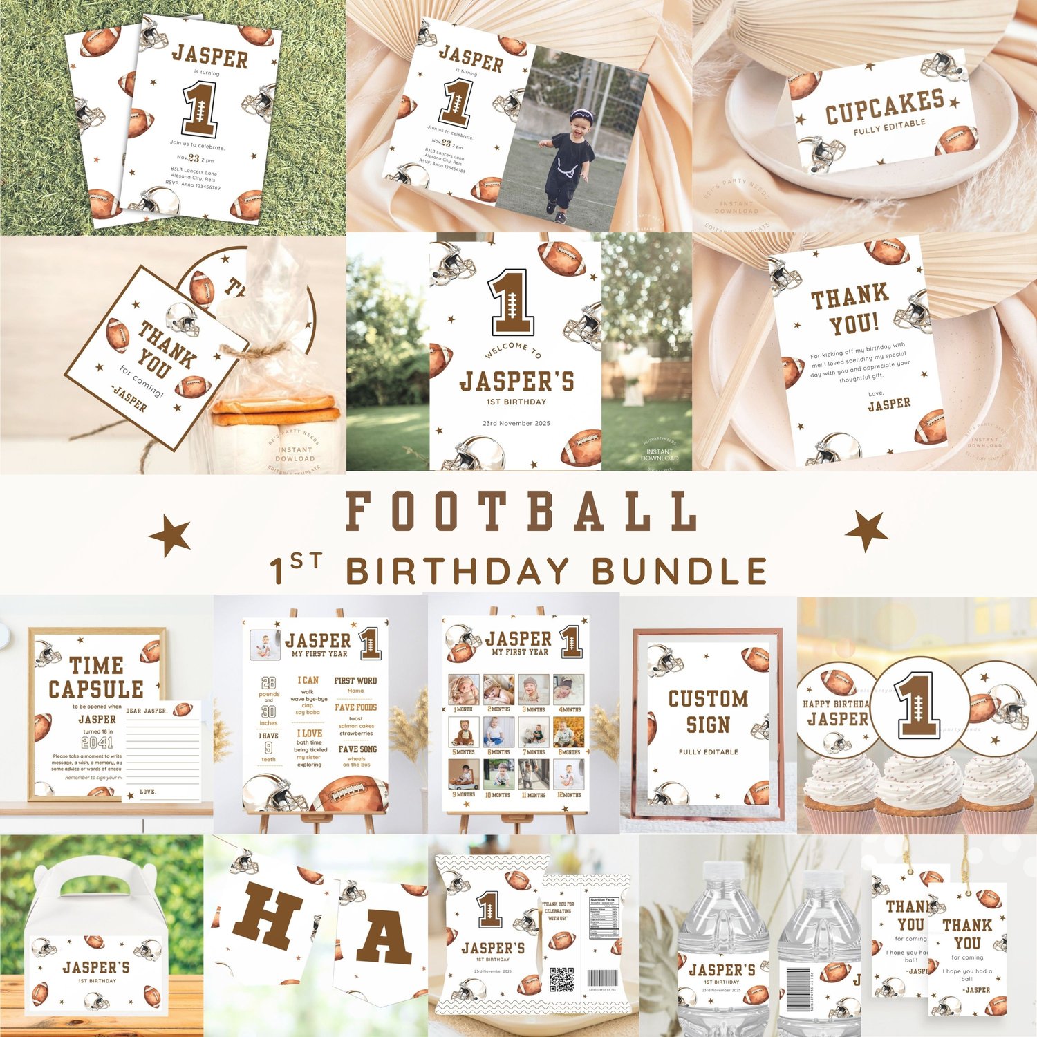 Football First Birthday Party Bundle, First Year Down Birthday Bundle, Editable Rookie Year Birthday Set, Football Birthday Invitation