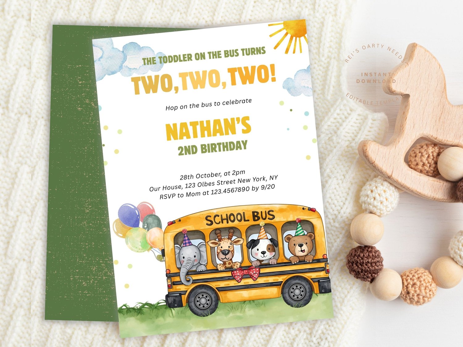 Editable Wheels On The Bus Birthday Invitation, Safari Animal School Bus Invite, Bus Birthday 2nd Invitation, Vehicle Transportation Invite