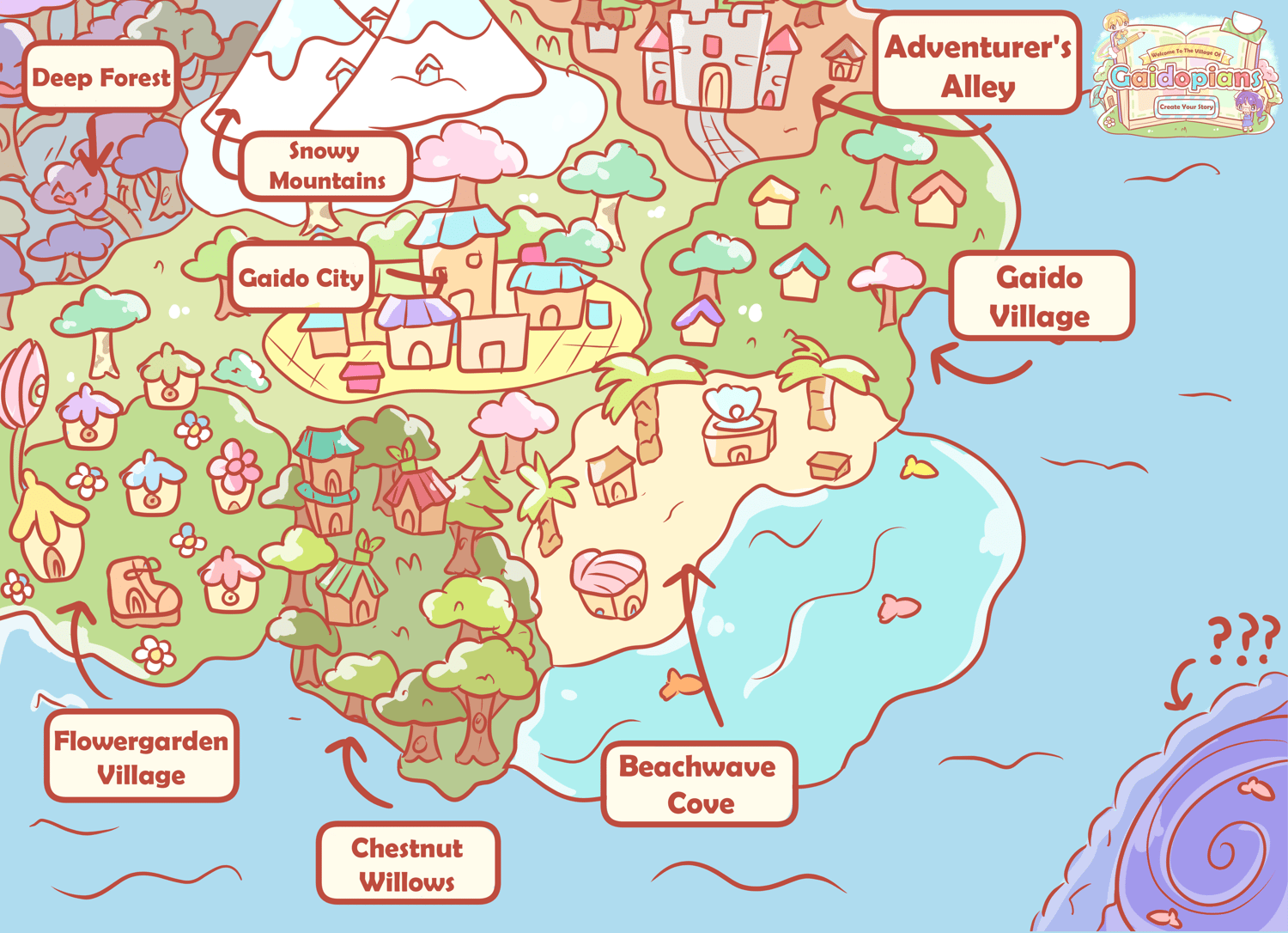As you step into Gaidopia, you are welcomed by warm spring gardens and sunny beaches, cold, misty mountains, and hidden forests waiting to be explored. The land is alive with magic, history, and the dreams of those who call it home. At the heart of Gaidopia are Gaido City and Gaido Village, where most Gaidopians live. Gaido City is a bustling, lively place, with towering skyscrapers and the latest technology.