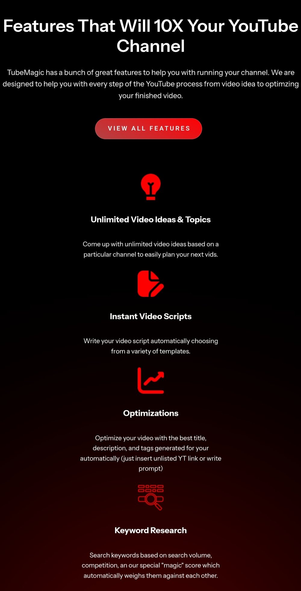 Get more subscribers and views on YouTube using our suite of state-of-the-art AI tools. We will help you find the right topics, write the right scripts, and optimize your videos correctly.