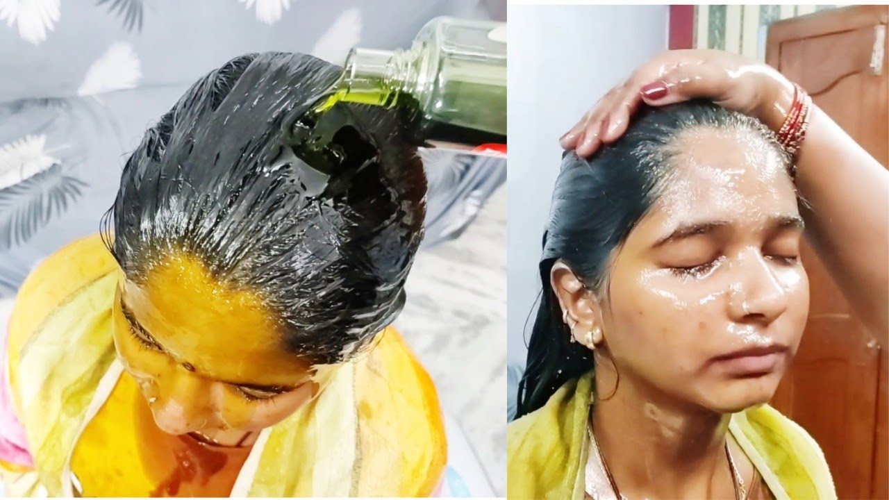 Oiling+henna+oiling applying heavily & sleek hairstyles