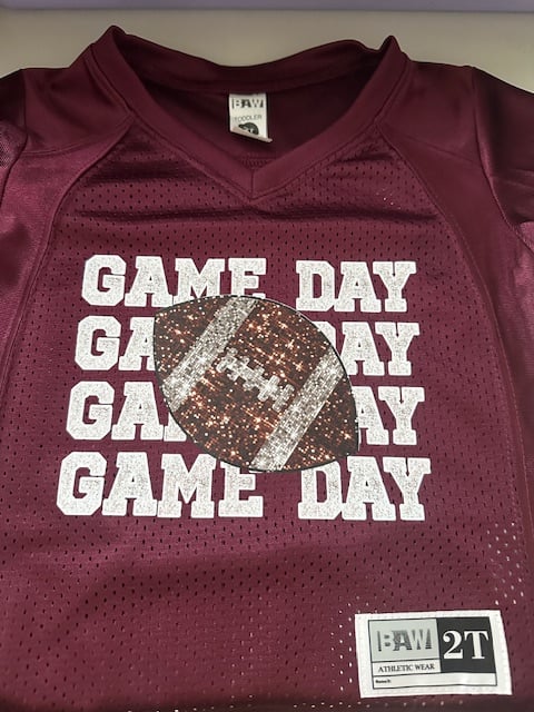 Bold glitter block letters and a glittery football front and center make this GAME DAY design is a must-have for little fans ready to cheer on their team in style.