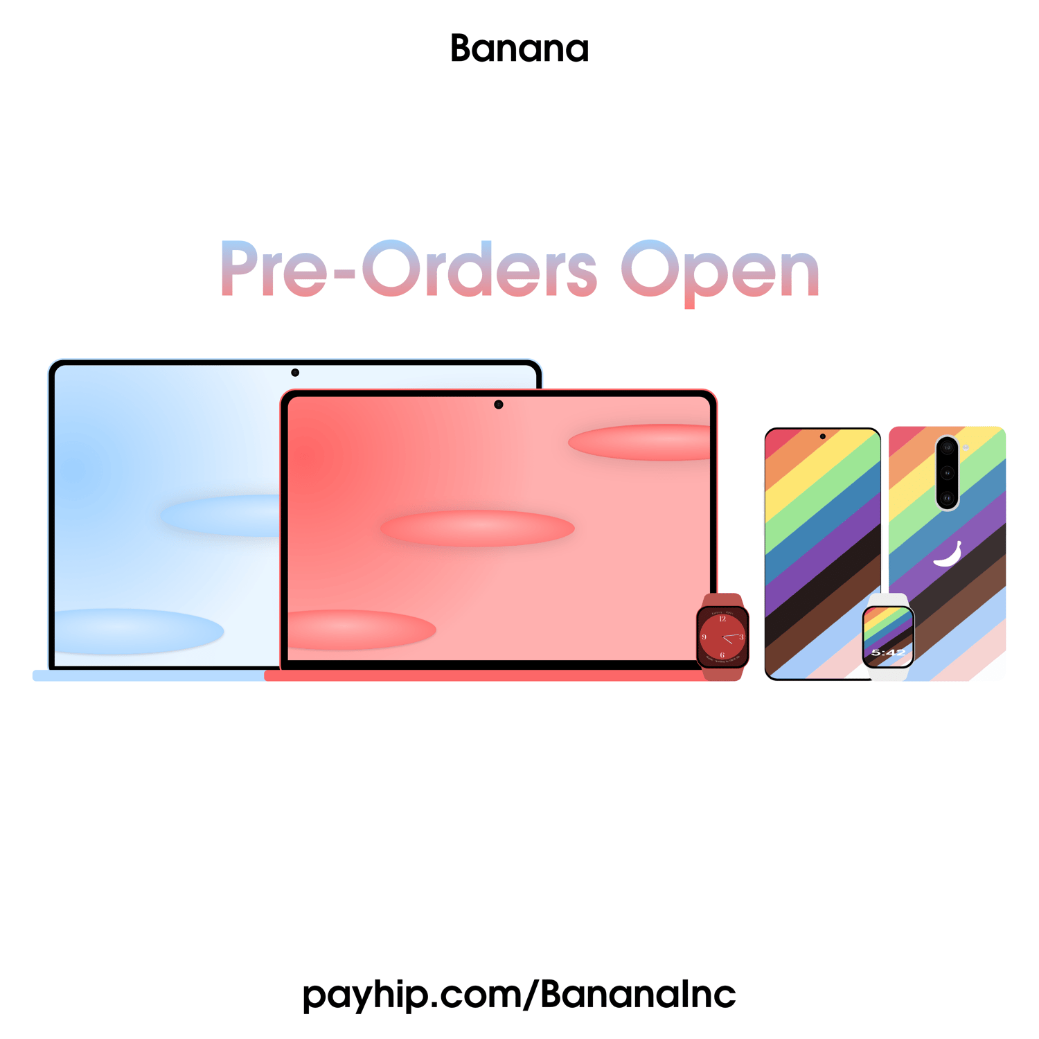May 29th - Today, Banana opens up pre-orders for their products revealed at 'The Rainbow Flip Side' Event, on May 26th, 2023. Pre-Orders open for the follows products.PeelBook (3 Series)Banana Watch (3)Silicone Pride Cases for Banana Phone (3 Series)