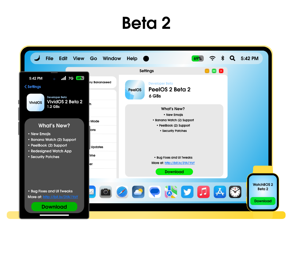 February 16th - Today Banana has released VividOS 2 Beta 2, PeelOS Beta 2, and WatchBOS 2 Beta 2 to Developers. This update features numerous of changes for VividOS 2 Beta 2, PeelOS Beta 2, and WatchBOS 2 Beta 2 to Developers.New EmojisBanana Wa...