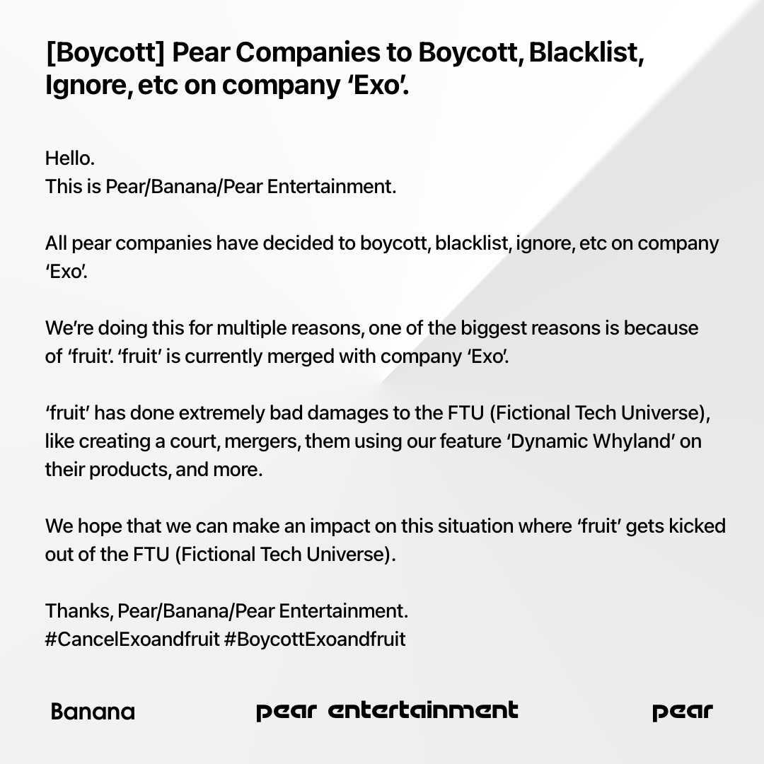 Hello.This is Pear/Banana/Pear Entertainment.All pear companies have decided to boycott, blacklist, ignore, etc on company ‘Exo’. We’re doing this for multiple reasons, one of the biggest reasons is because of ‘fruit’. ‘fruit’ is currently merge...