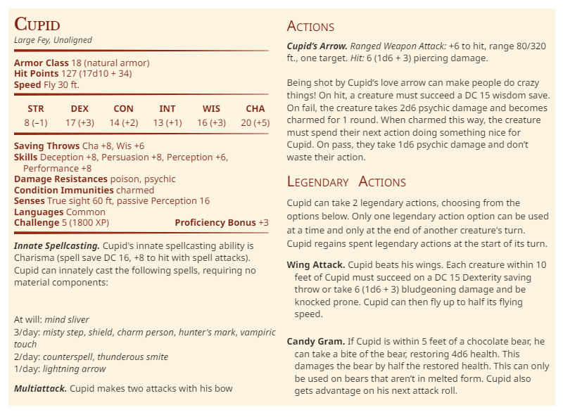 The angel of love makes an appearance! A hit from one of his arrows will make your players do some zany things! You DO NOT want to be his valentine.