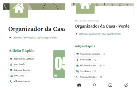 A primeira coisa que aparece no Organizador da Casa é a adição rápida: cinco botões pensados pra agilizar o seu dia, especialmente se você usa o template pelo celular. A proposta é deixar tudo a um toque de distância, sem precisar abrir várias páginas ou procurar onde anotar cada coisa.