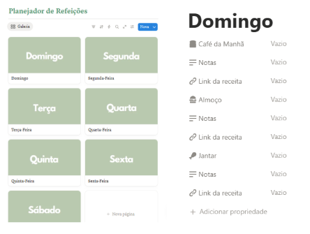 Cada dia vem com espaço para as três refeições principais (já configuradas por padrão, mas totalmente personalizáveis), além de um campo para notas e outro para link da receita. Assim, você consegue planejar o que vai comer, salvar inspirações e evitar o famoso “o que faço hoje?” no meio da correria.