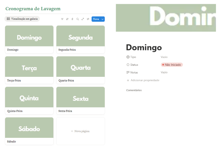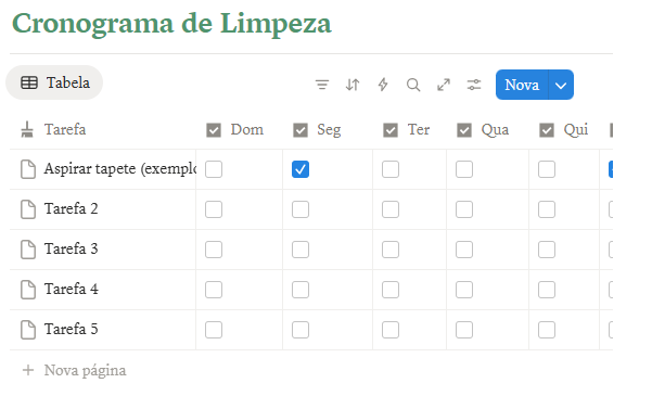 Funciona em formato de tabela, onde você adiciona cada tarefa e marca os dias da semana em que ela será feita usando checkboxes. Fica tudo bem visual, o que ajuda a entender sua rotina de um jeito prático e fácil de atualizar.