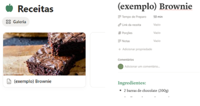 Abaixo disso, há um campo em branco para escrever ingredientes e modo de preparo da forma que preferir. A área já vem com um exemplo de receita de brownie, e tudo pode ser totalmente personalizado.