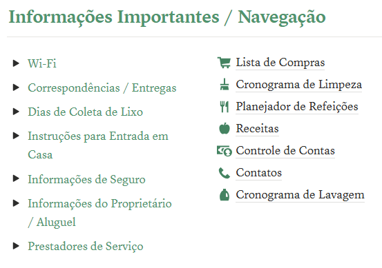 Essa área reúne tudo o que facilita o dia a dia, deixando num só lugar aqueles dados que você sempre precisa ter à mão, sem bagunçar o restante do planner.