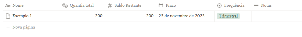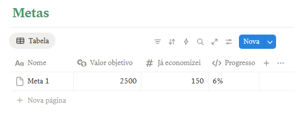 Aqui você define o objetivo, o valor total e registra cada depósito que fizer. A tabela calcula automaticamente a porcentagem alcançada, então você consegue acompanhar seu avanço de forma visual.