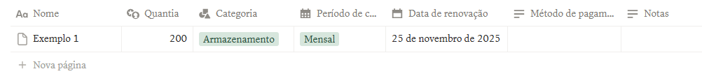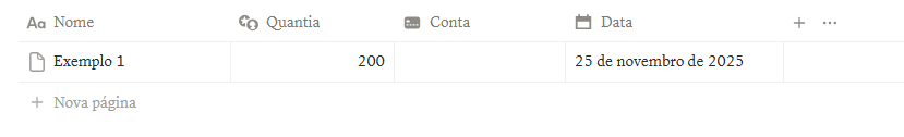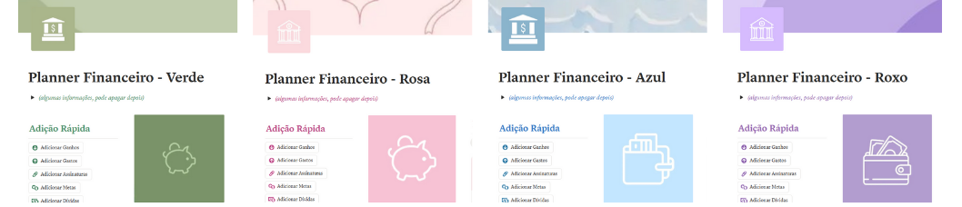 As seções de gastos, ganhos, assinaturas e dívidas aparecem em formato de galeria (quadro), mas cada uma funciona como uma tabela completa. Isso deixa tudo mais visual na hora de navegar, mas sem perder o lado prático: você registra valores, datas, categorias e formas de pagamento direto nas entradas.
