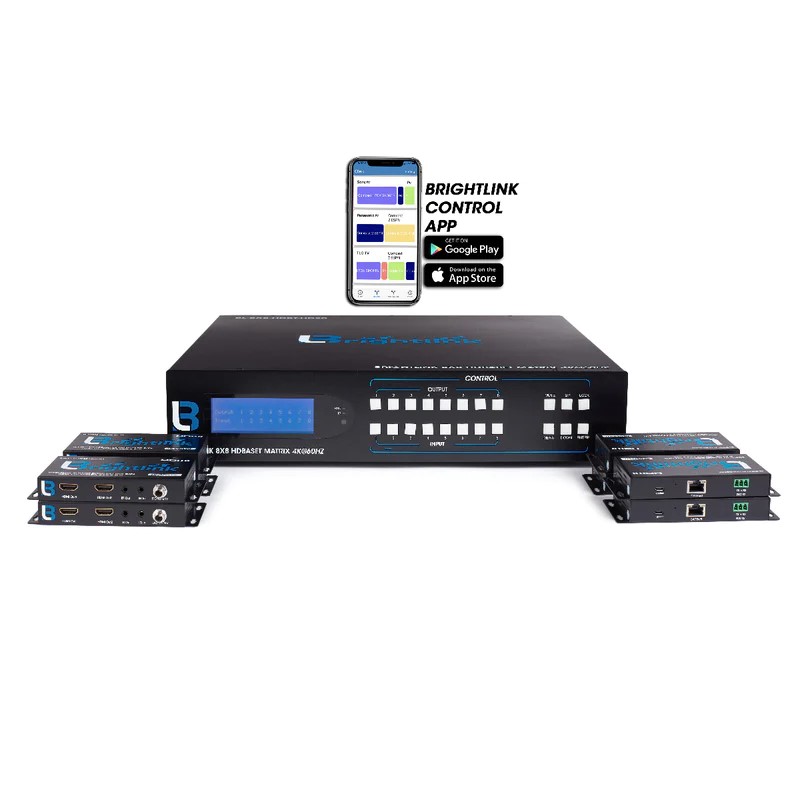 Brightlink Pro Series HDMI 2.0 8x8/8x16/8x24 HDMI / HDBaseT Matrix with 4Kx2K@60Hz, HDR, YUV 4:4:4, 18Gbps, HDCP 1.4/2.2 - APP CONTROL - Distance upto 70m/228ft away | C/W 8 HDBaseT Receivers with 2ea HDMI outputs and POC/POE