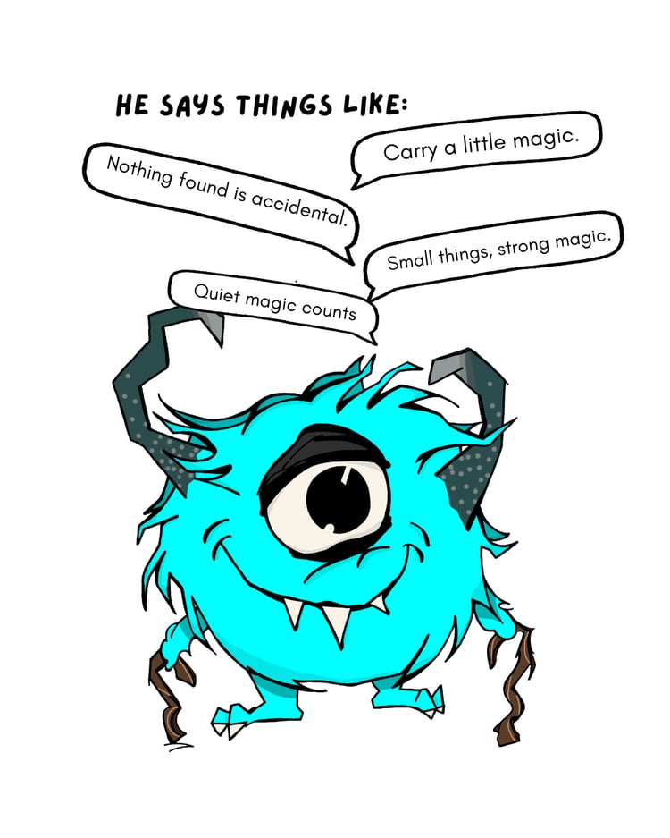 He says things like, "Nothing found is accidental." "Pocket it. It matters." "Small things, strong magic." "This came with a moment." "Carry a little courage." "Quiet magic counts."