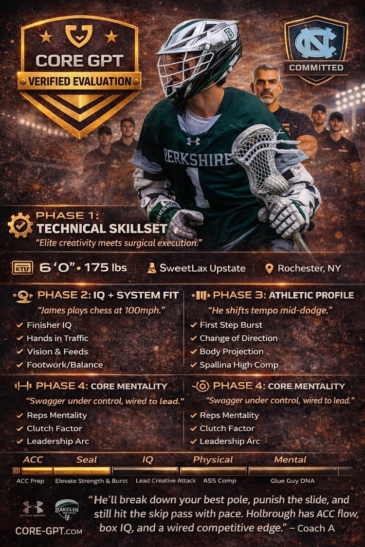 Holbrough blends box lacrosse discipline with field lacrosse explosiveness. His 48G/38A line at Berkshire shows he’s both a volume scorer and distribution threat — rare in attackers at this stage.