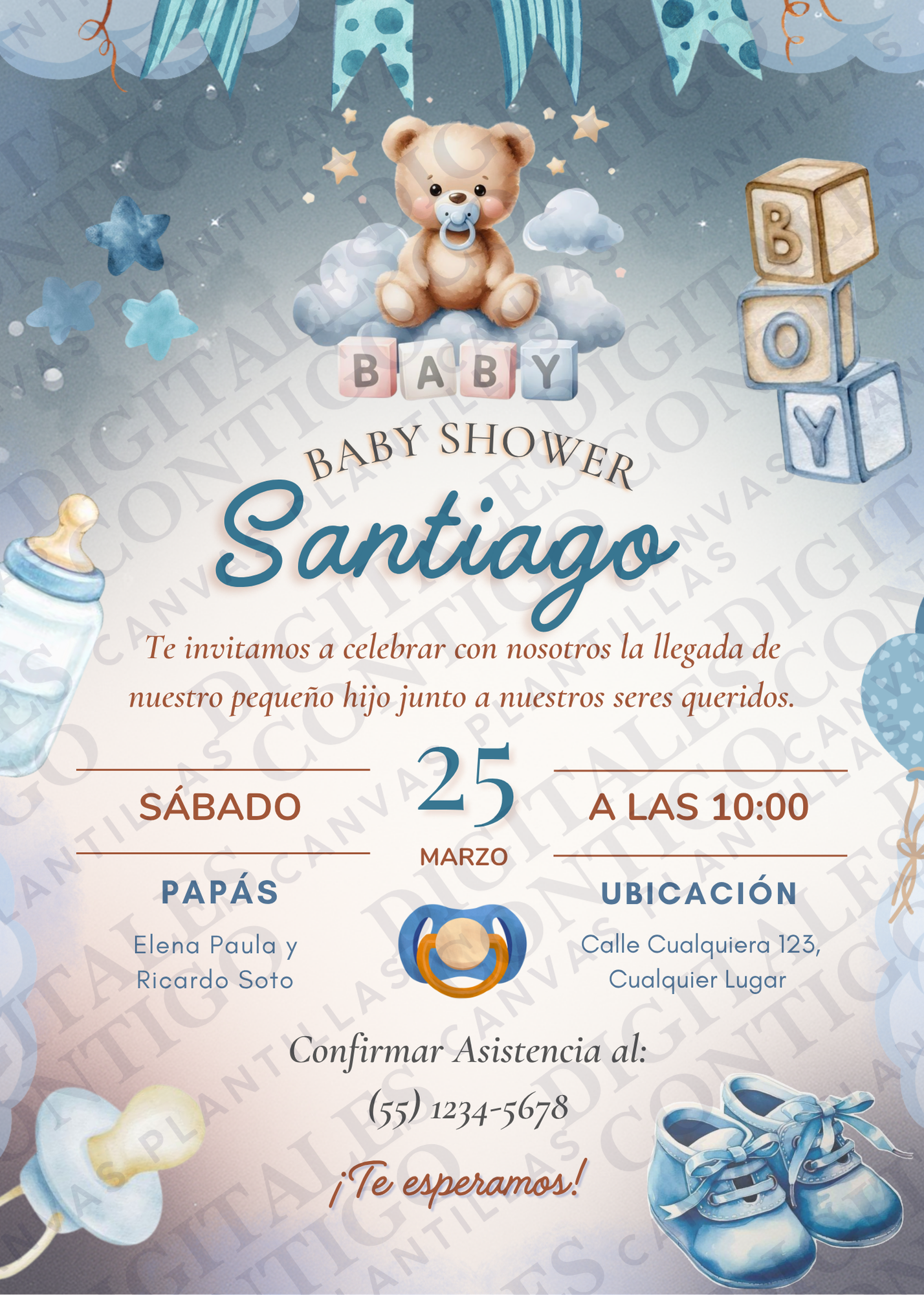 🧸 Invitación Vertical Baby Shower Ilustrado Azul y Marrón 💙