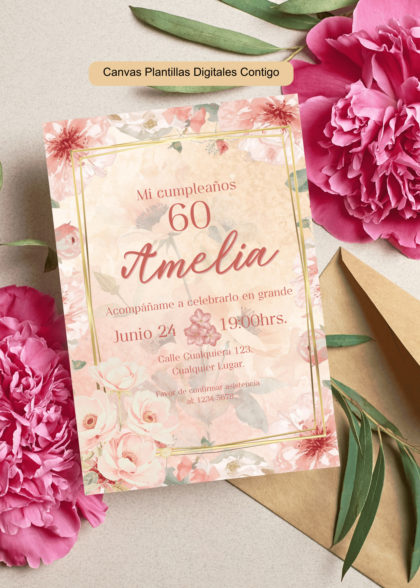 Invitación Digital Editable Cumpleaños 60 Floral Elegante Rosa | Plantilla Canva PDF