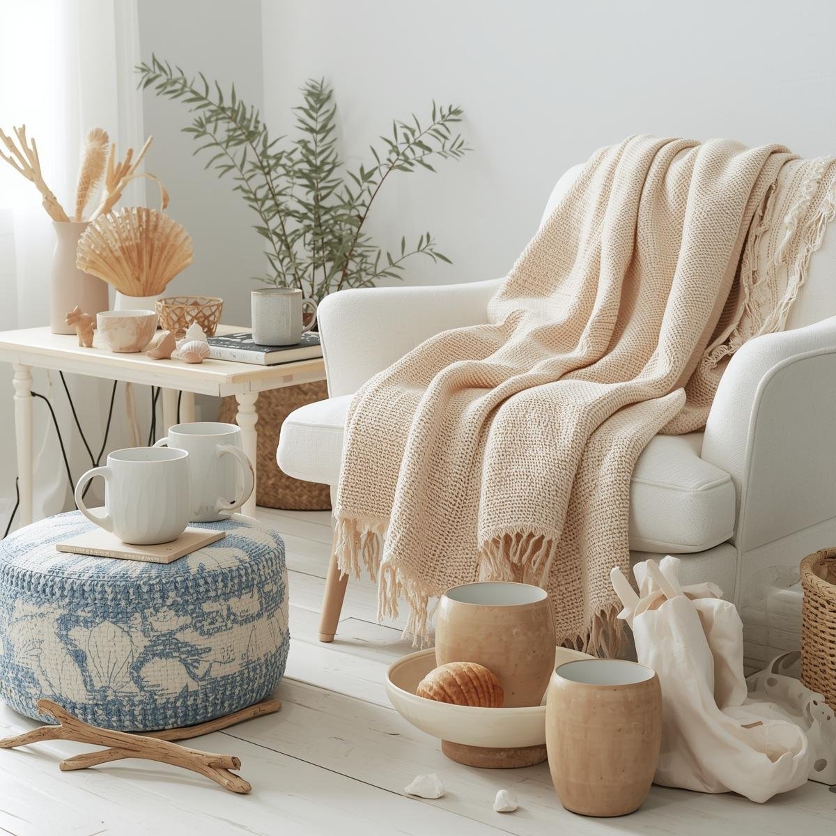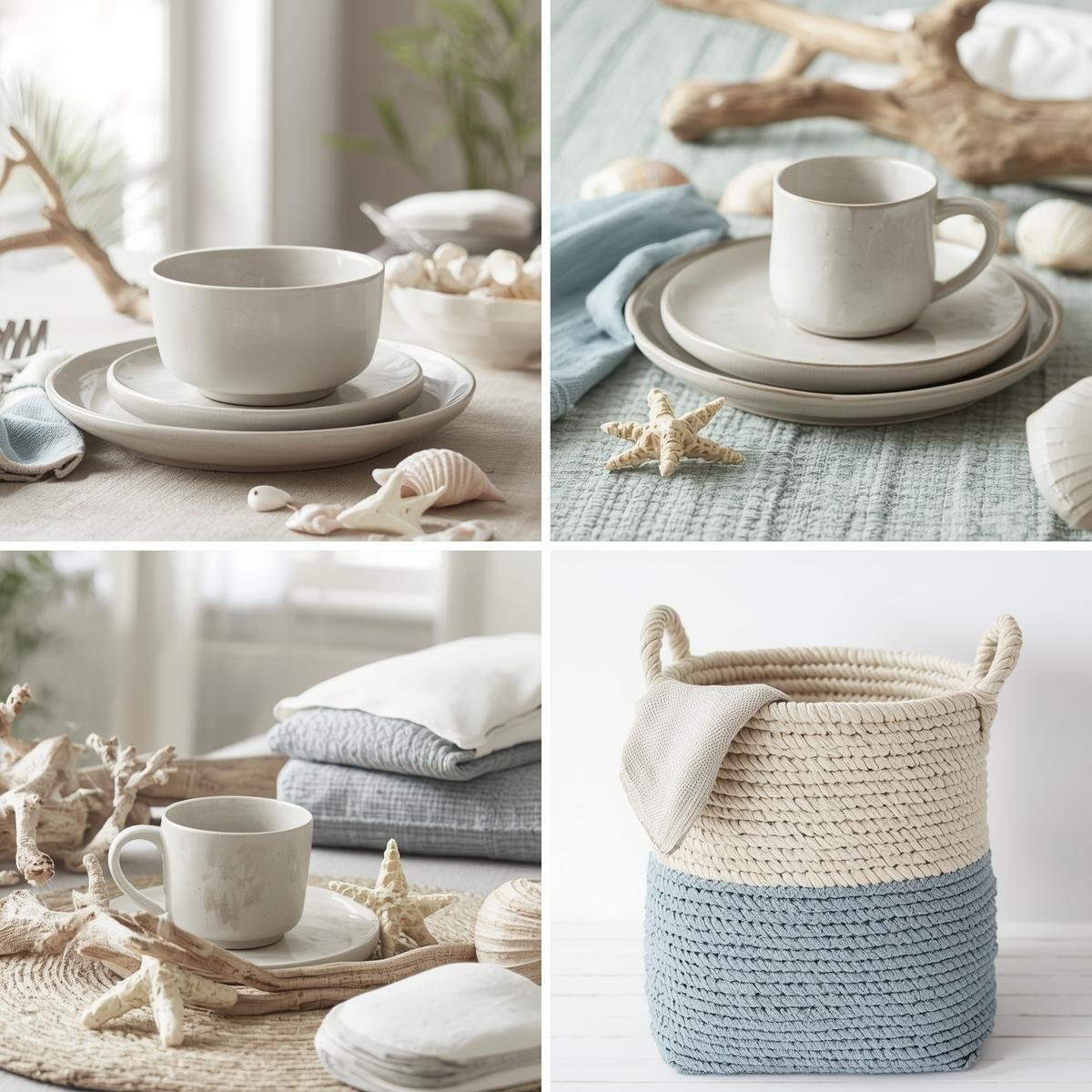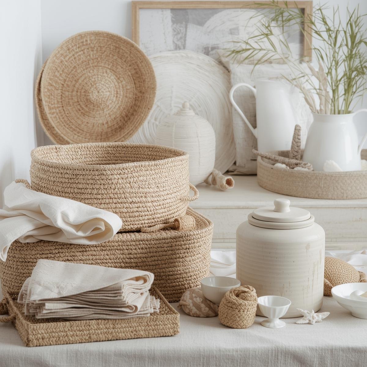 Core products include linen fabrics, woven baskets, ceramic decor, and neutral home accents. These materials add texture and warmth without overwhelming a space.