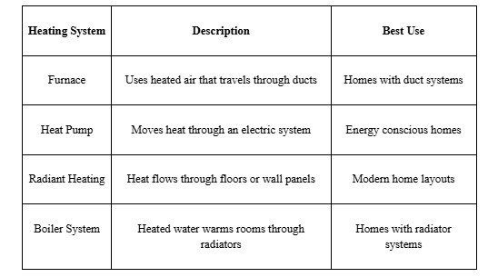 Homes use different heating systems based on design and heating needs. Installers select equipment that fits the home layout.
