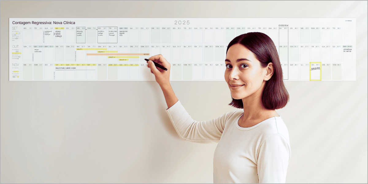 Trimestral, semestral e anual. Mais de 1 metro de largura no seu ambiente para convergir suas prioridades diárias e conferi-las todo dia em um só olhar, longe de distrações digitais.